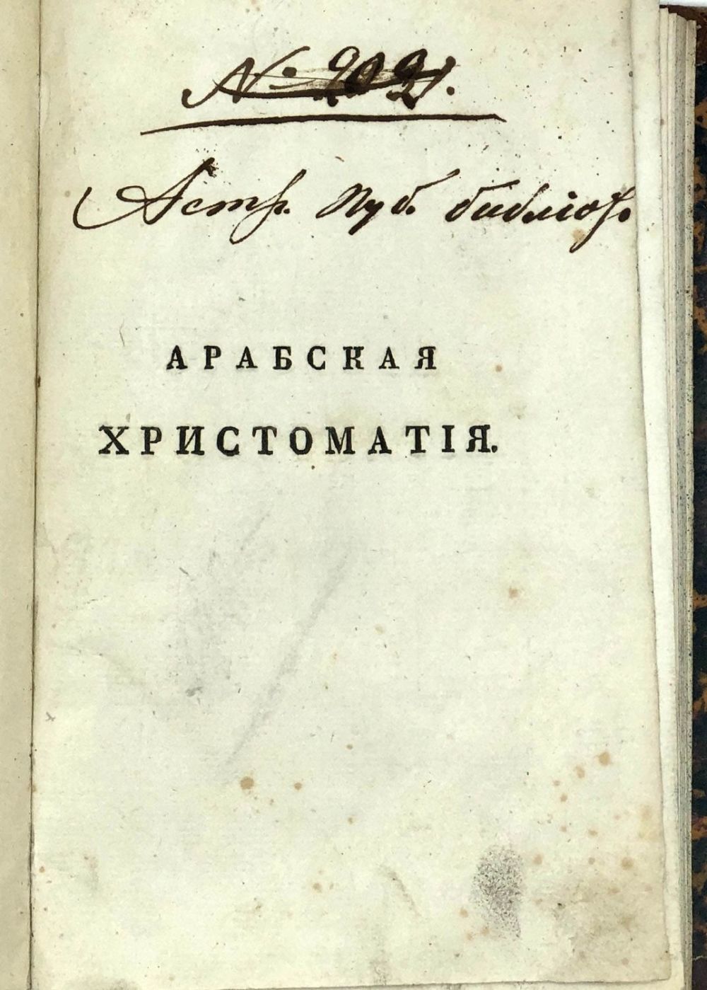 На авантитуле — запись орешковыми чернилами “№ 2021 [зачеркнуто] / Астр. пуб. библиот.”