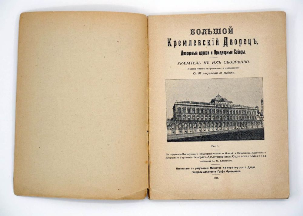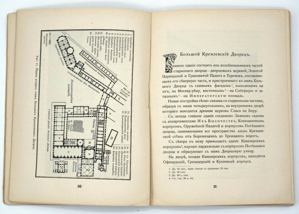 Москва, Синодальная Типография, 1916. – 169,[1] с.: ил. Формат — 8° (19,0х14,5).Обложка – издательская, бумага; корешок – плоский; обрез – традиционный. Сохранность – хорошая; имеются незначительные надрывы на корешке.Большой Кремлевский дворец, построенный в середине XIX века по проекту известного русского архитектора К.А. Тона, — один из интереснейших памятников Московского Кремля. Издание открывается кратким историческим обзором Кремлевских дворцовых зданий, дальнейшие главы посвящены описанию залов, лестниц, церквей, различных частей дворца. Текст снабжен многочисленными фотоснимками и планами. В наше время книга особенно интересна тем, что в ней содержатся сведения о несуществующих ныне (уничтоженных) постройках на территории Кремля.