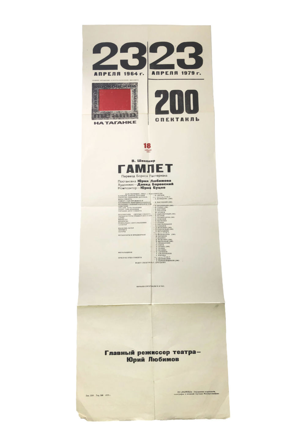 Афиша юбилейного 200-го спектакля в котором принимал участие Владимир Высоцки (его участие обозначено цифрой 200, так обозначали всех актеров, кто отыграл все 200 спектаклей).