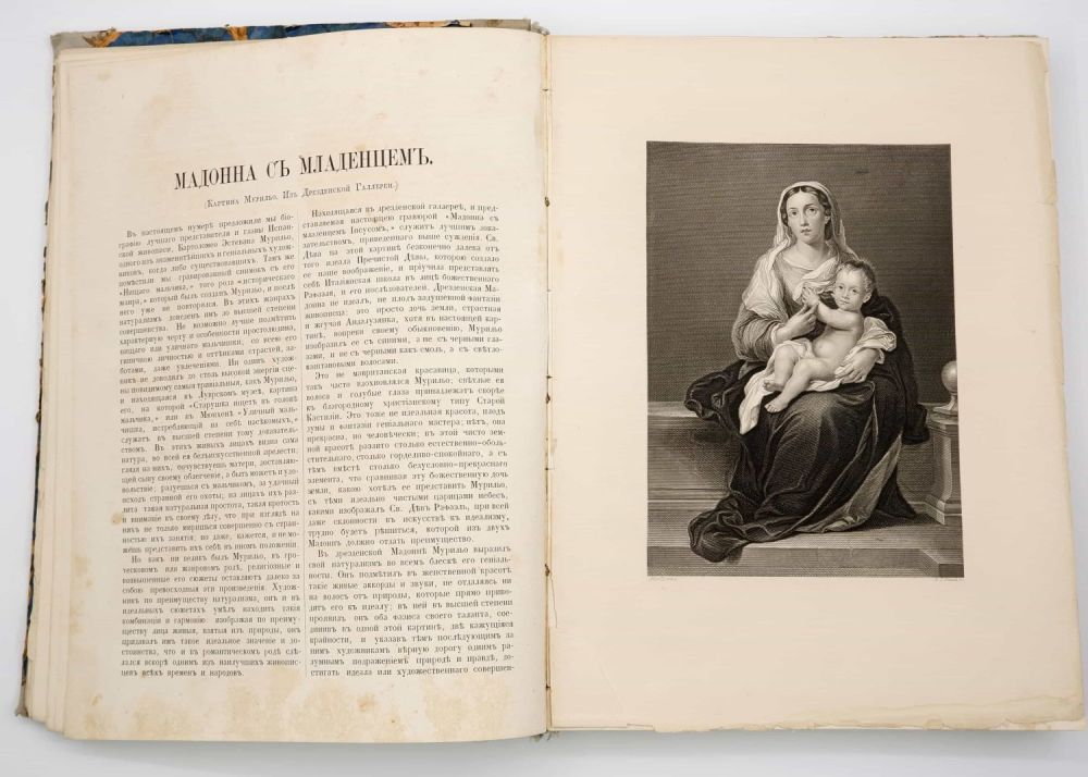 Превосходно иллюстрированное издание, вышедшее под редакцией известного искусствоведа А.Н. Андреева (1830-1891). Собрание выдающихся произведений живописи, ваяния и зодчества различных школ Европы. Текст издания состоит из биографий художников и описания созданных ими шедевров, сопровождается двумя политипажами в тексте и одной гравюрой на отдельном листе, отнесенной к каждому из шедевров. Гравюры с описываемых в издании картин выполнены крупнейшими мастерами голландской, фламандской, французской и итальянской художественных школ.