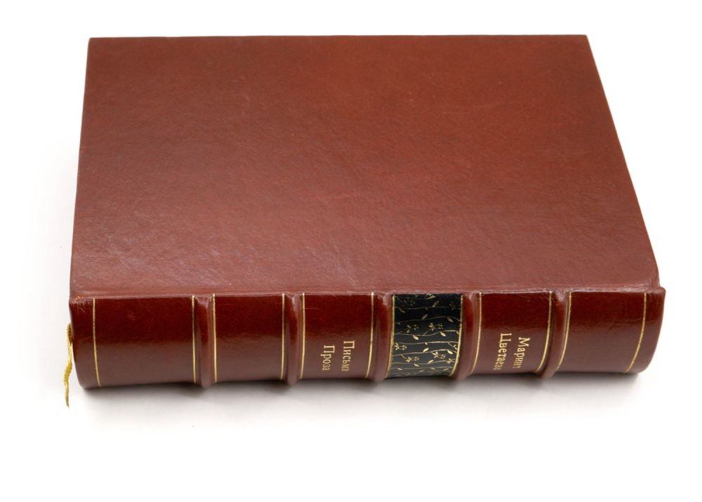Переплет – художественный, картон, кожа; корешок – коже, разделен бинтами на 6 сегментов; форзацы – бумага с рисунком; обрез – крашеный; имеется ляссе.