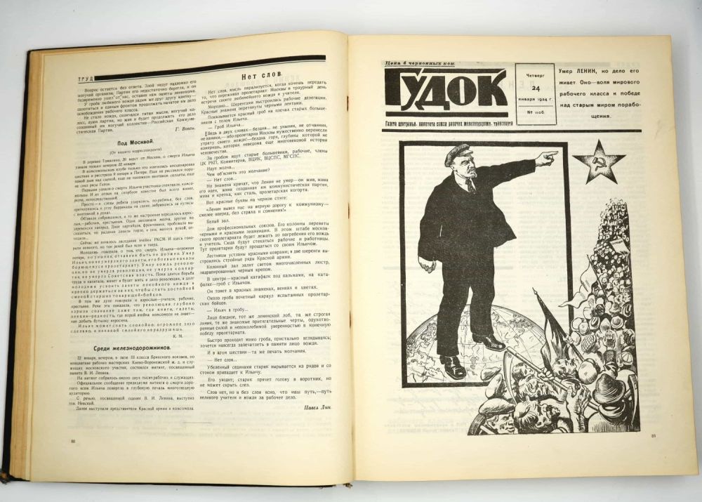 Одна из первых мемориальных книг, вышедшая непосредственно после смерти В.И. Ленина (отпечатана в апреле-июне 1924 г.). Факсимильное воспроизведение материалов центральных, отраслевых и национальных газет и журналов, вышедших с 23 по 30 января 1924 г. и посвященных памяти умершего вождя. Книга содержит редкие фотографии, речи, статьи и письма, как партийных лидеров, так и простых граждан Советского Союза, "отклики масс, голоса с фабрик, с заводов, из красноармейских частей".