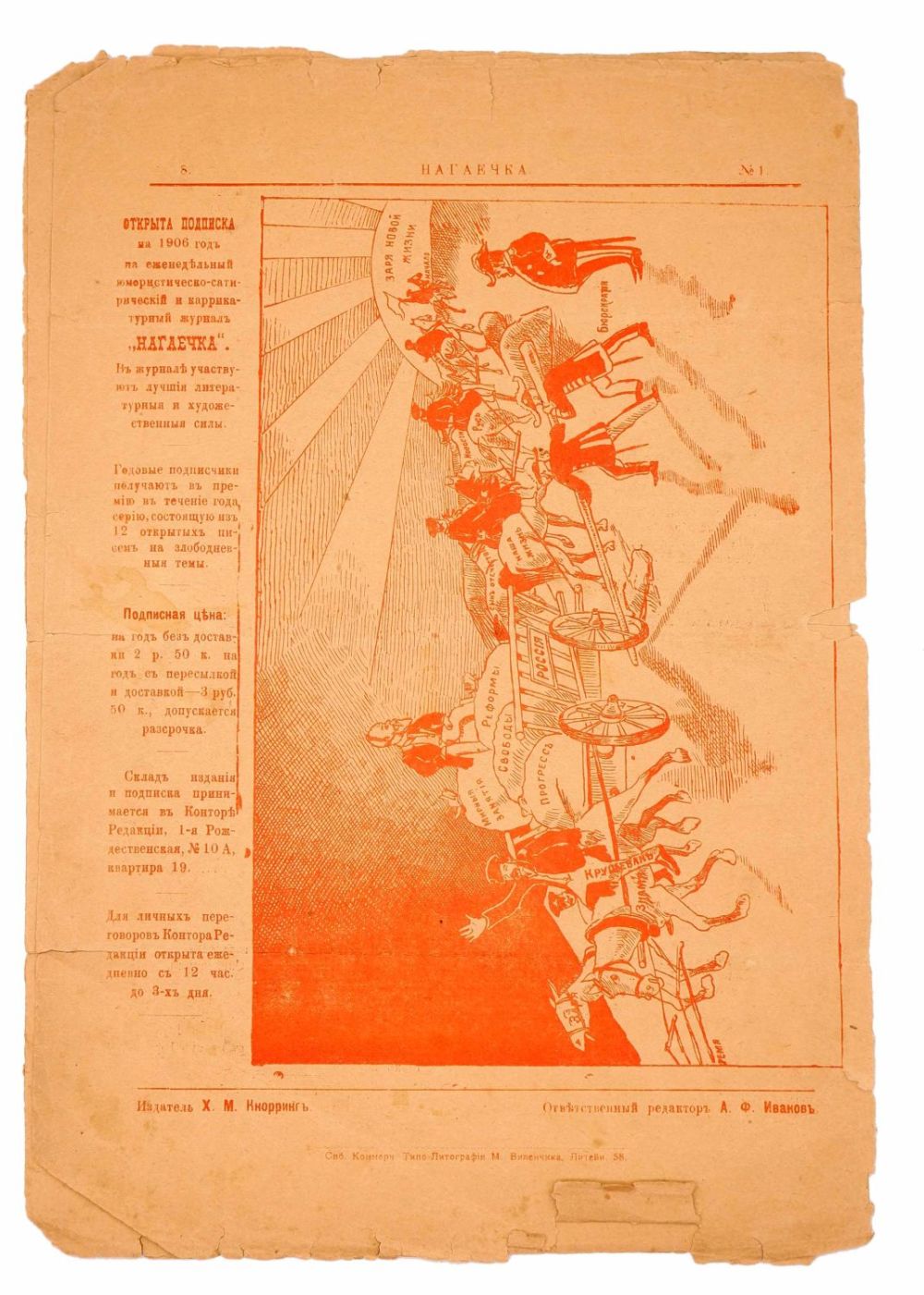 Первый выпуск сатирического журнала, издававшегося в Санкт-Петербурге в 1906 году, во «Владимирской» типо-литографии. Редактор – В.М. Арнольд, издатель – А.В. Деденев. Вышло всего два номера.