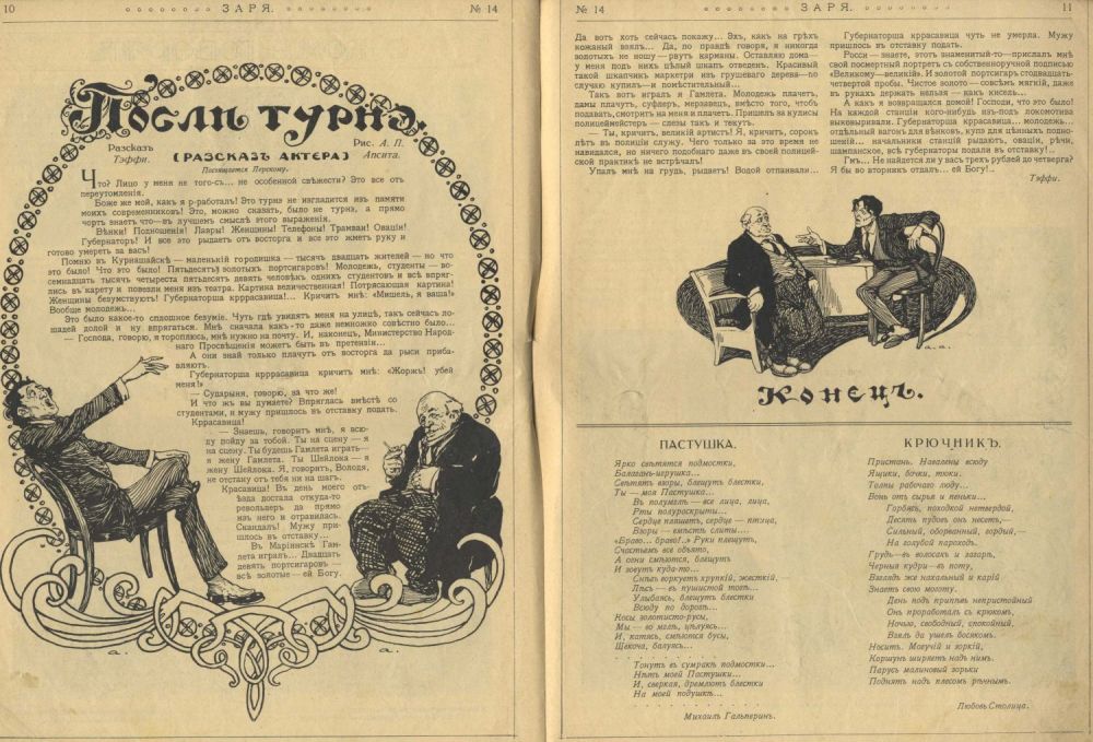 В выпуске первая публикация рассказа Тэффи «После турне». С иллюстрациями А.П. Апсита.