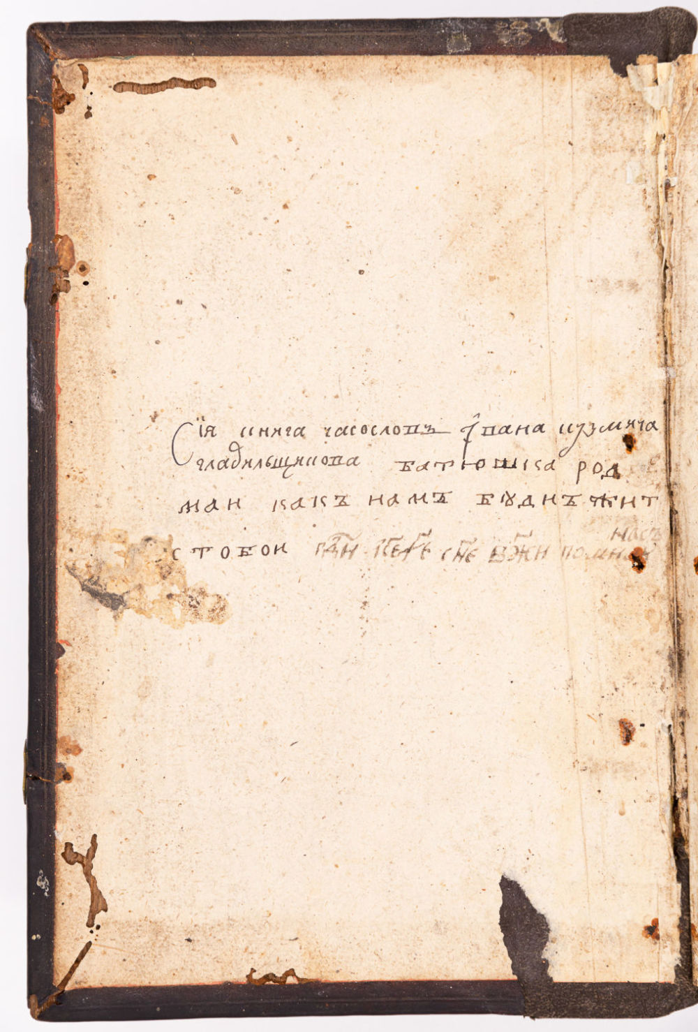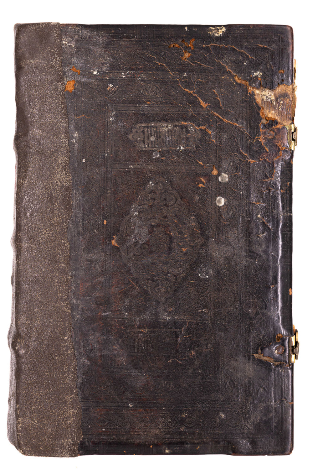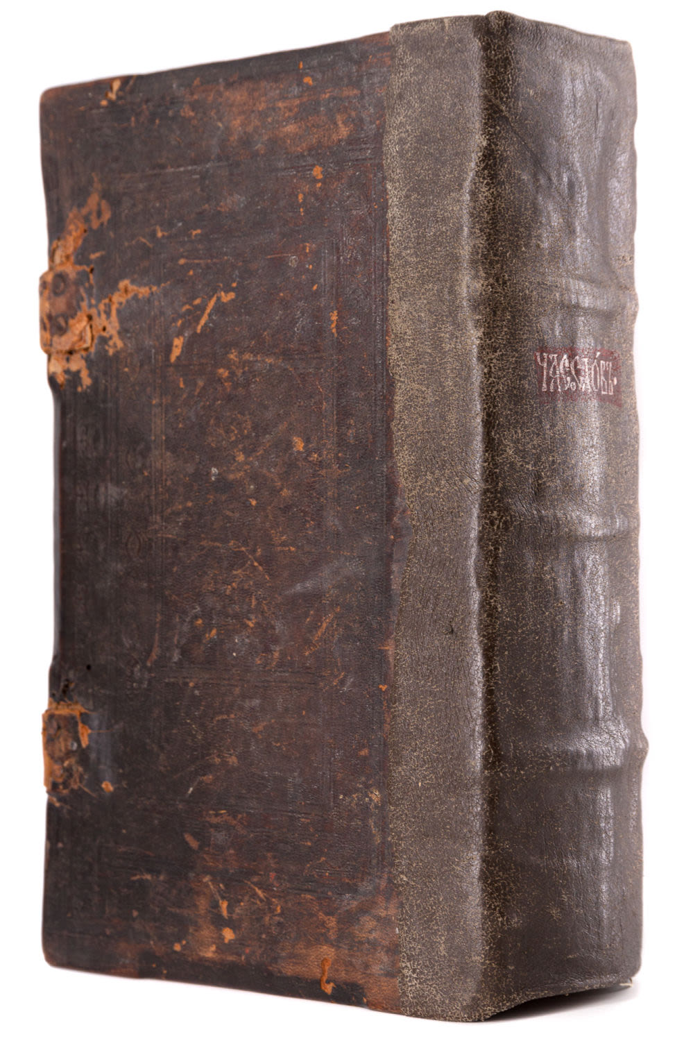 Сохранность – незначительные утраты фрагментов кожи на крышках, корешок и застёжки поновлены, разводы и следы воска в блоке, реставрация краёв отдельных листов в начале блока (фрагменты наращены, текст восстановлен от руки).