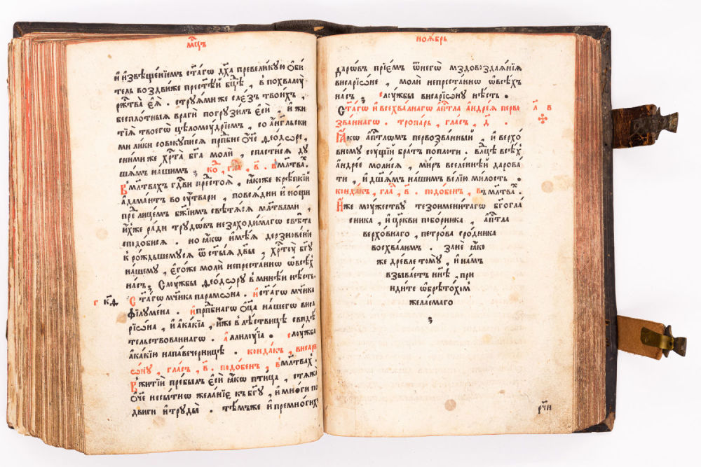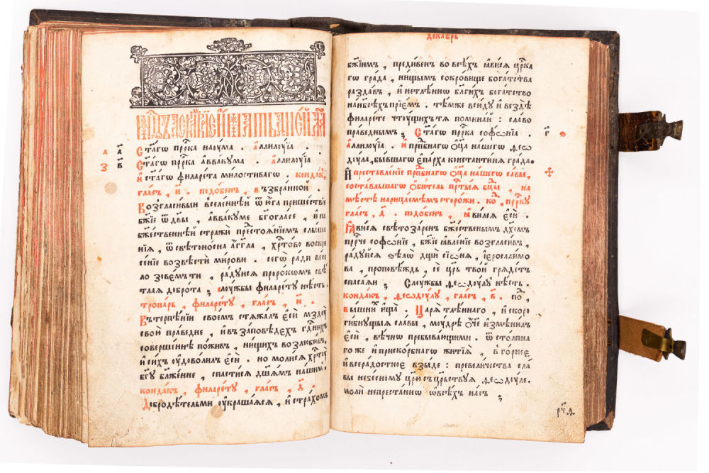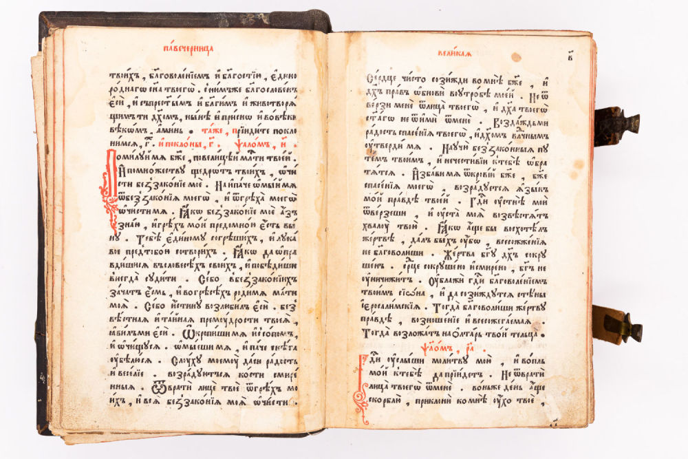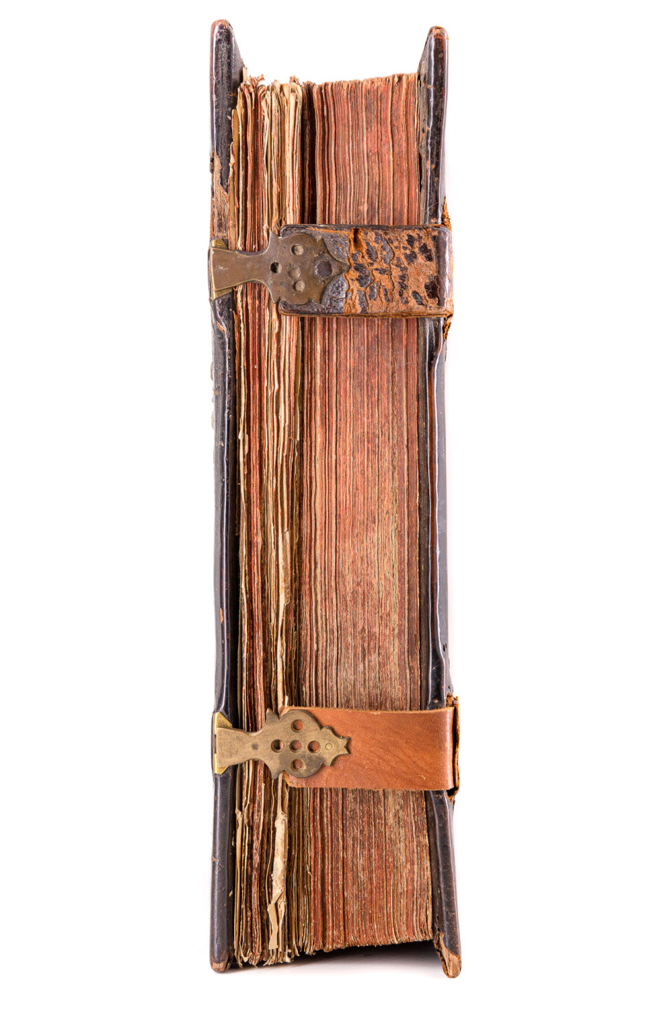 Сохранность – незначительные утраты фрагментов кожи на крышках, корешок и застёжки поновлены, разводы и следы воска в блоке, реставрация краёв отдельных листов в начале блока (фрагменты наращены, текст восстановлен от руки).