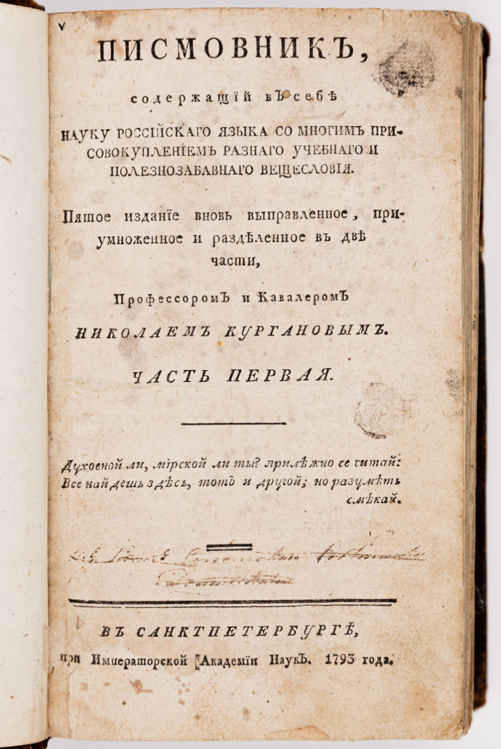 Самая ранняя и самая известная русская филологическая энциклопедия педагога, создателя учебной литературы по русской словесности, математике, навигации и астрономии, Николая Гавриловича Курганова (1725-1796).