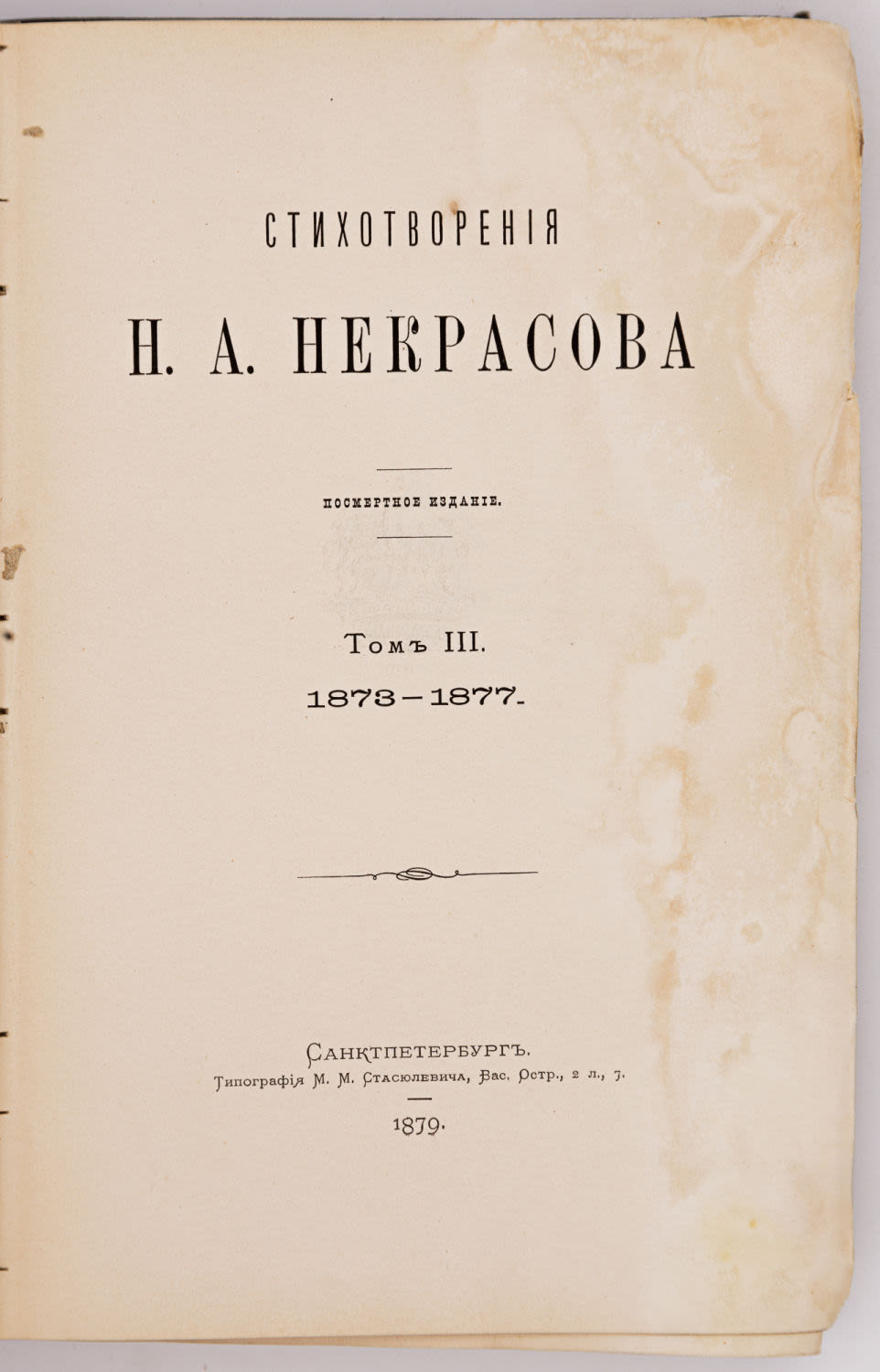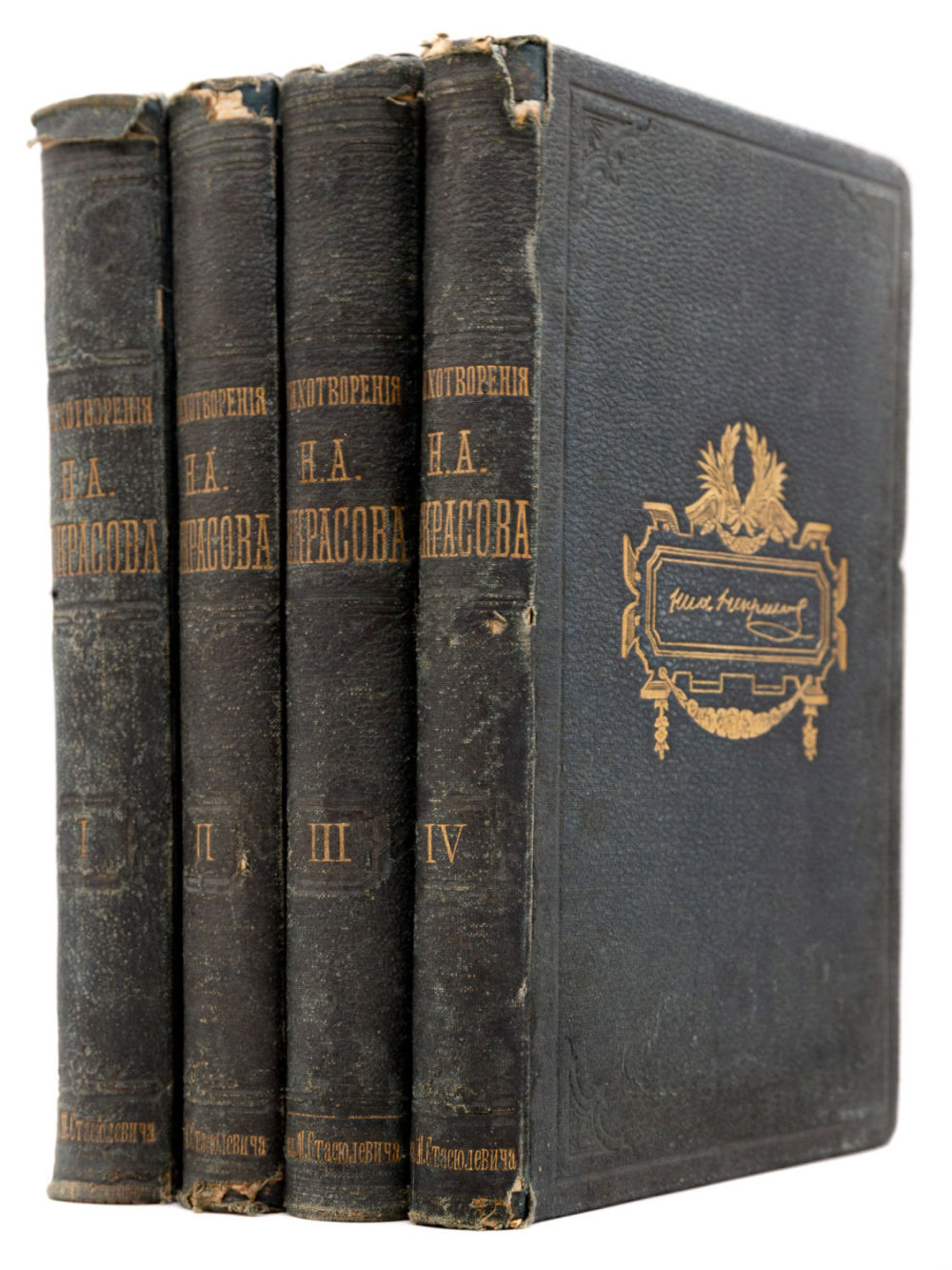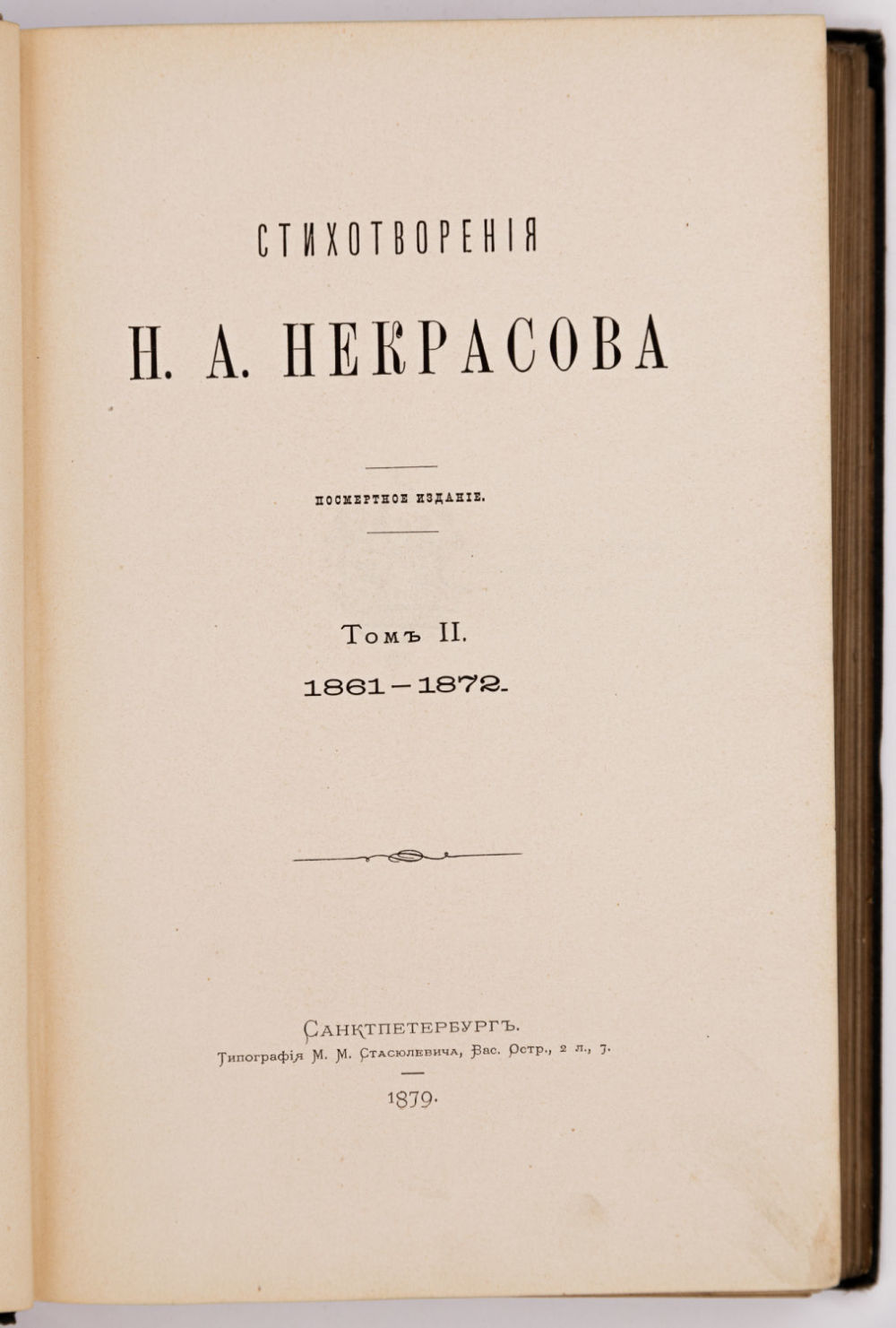 Первое посмертное издание стихотворений Николая Алексеевича Некрасова (1821-1878). Напечатано по инициативе сестры Некрасова — А.А. Буткевич. Под редакцией известного библиографа С.И. Пономарева. При участии М.E. Салтыкова-Щедрина, Г.З. Елисеева, А.Н. Пыпина, М.М. Стасюлевича.