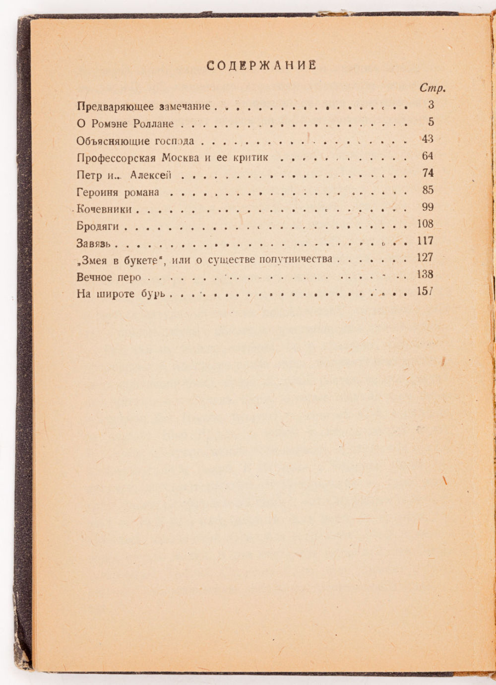 Рецензии и критические заметки, вошедшие в издание: «Жизнь Клима Самгина» М. Горького, «О Ромэне Роллане», «На рубеже двух столетий» А. Белого, «Петр Первый» А. Толстого, «Гидроцентраль» М. Шагинян и др.
