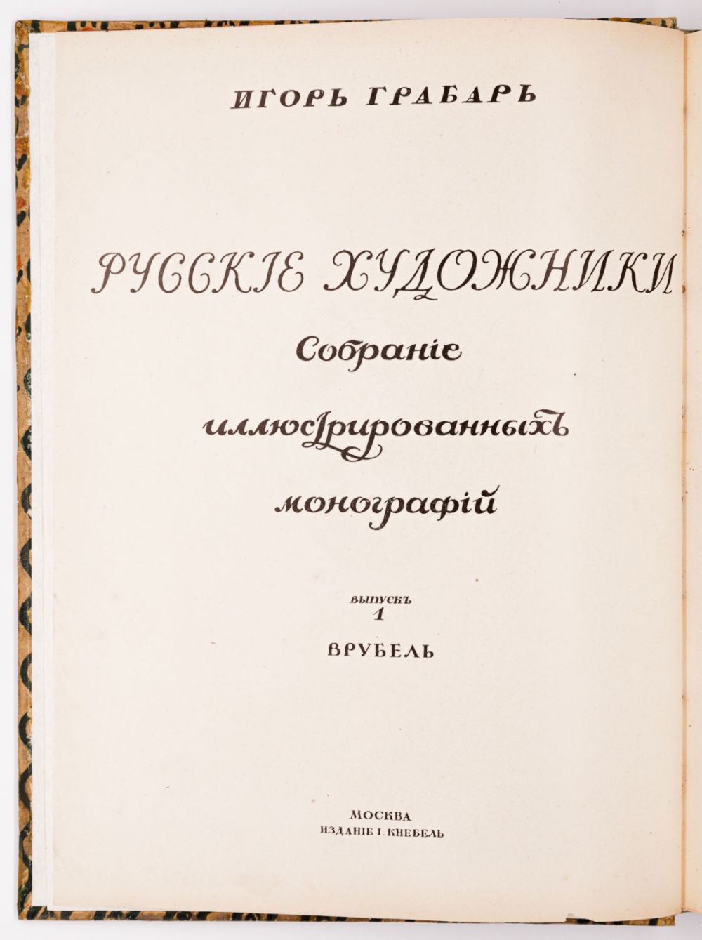 Первый выпуск, посвященный творчеству Михаила Врубеля, вышел вскоре после смерти художника. Текст подготовлен крупным российским искусствоведом Степаном Петровичем Яремичем (1869-1939). Иллюстрации на отдельных вклейках — самые известные работы М.А. Врубеля — выполнены в цвете. Книгу предваряет предисловие Игоря Грабаря, в котором автор описывает историю создания серии монографий о великих русских художниках, рассказывает об использовании в настоящей книге о Врубеле своих запасов фотографий и архивных материалов.