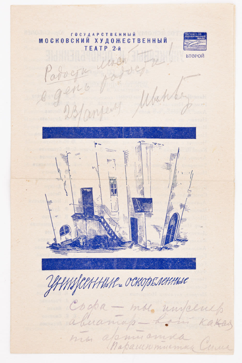 Дарственная надпись Ивана Николаевича Берсенева на обложке афиши к спектаклю «Униженные и оскорбленные»: «Радости моей в день радости! 23 апреля».
