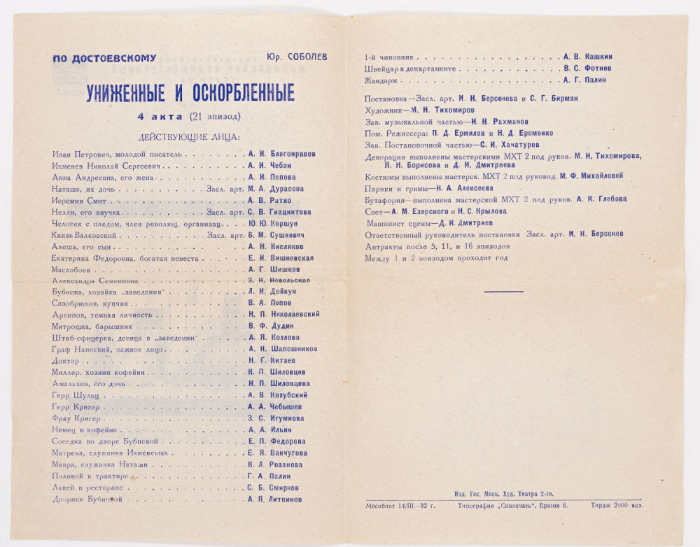 4) Афиша к спектаклю «Униженные и оскорбленные». М.: Тип. «Совпечать», 1932. – [4] с.: ил.; 24х15 см.