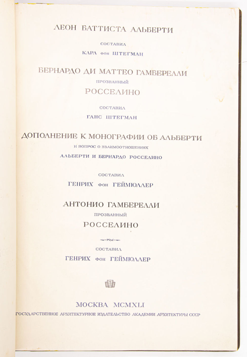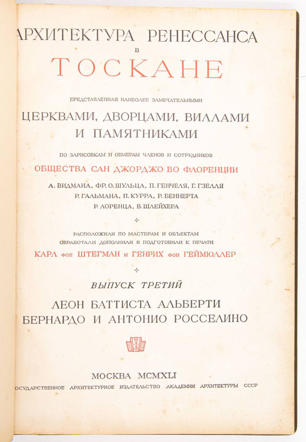 Вып. III: Леон Баттиста Альберти, Бернардо и Антонио Росселино. 1941. – 52, [4] с.: ил., [29] л. ил.; 48×33 см.