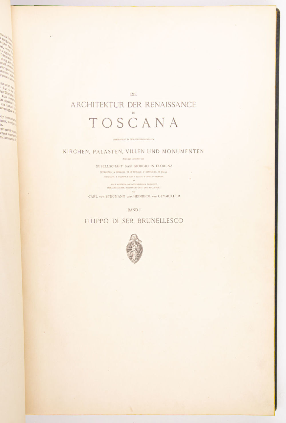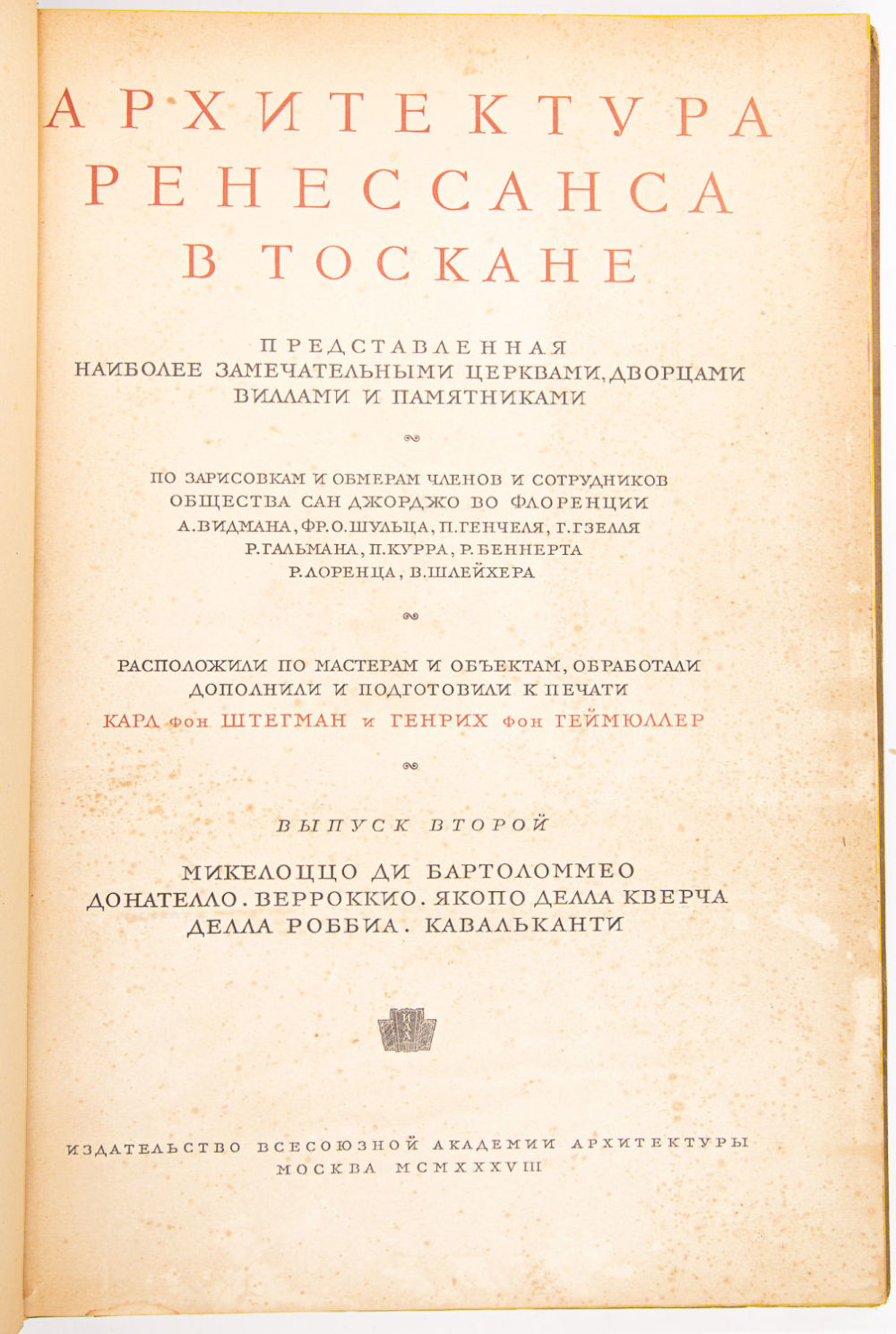 По зарисовкам и обмерам членов и сотрудников Общества Сан Джорджо во Флоренции А. Видмана, Фр.О. Шульца, П. Генчеля, Г. Гзеля, Р. Гальмана, П. Курра, Р. Беннерта, Р. Лоренца и В. Шлейхера; Расположили по мастерам и объектам, обработали, дополнили и подготовили к печати Карл фон Штегман и Генрих фон Геймюллер. М.: Изд-во Всесоюзной академии архитектуры, 1936-1941.