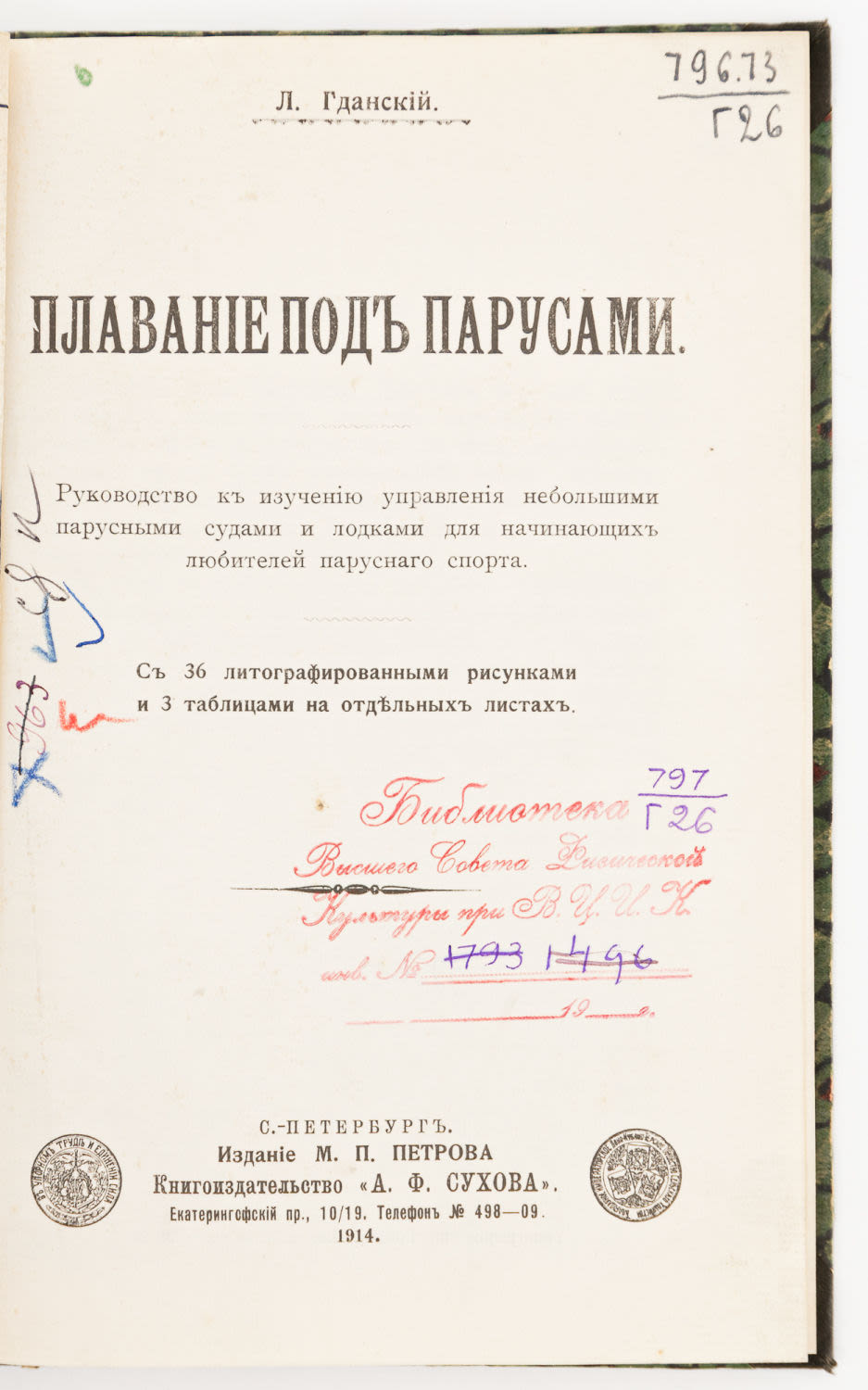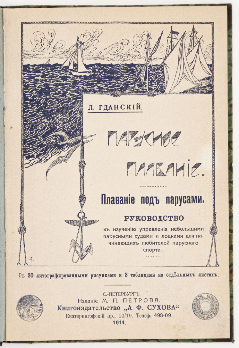 Руководство к изучению управления небольшими парусными судами и лодками для начинающих любителей парусного спорта. СПб.: Изд. М.А. Петрова, 1914. – 79, [1] с.: ил., [8] л. ил.; 22,5х15 см.
