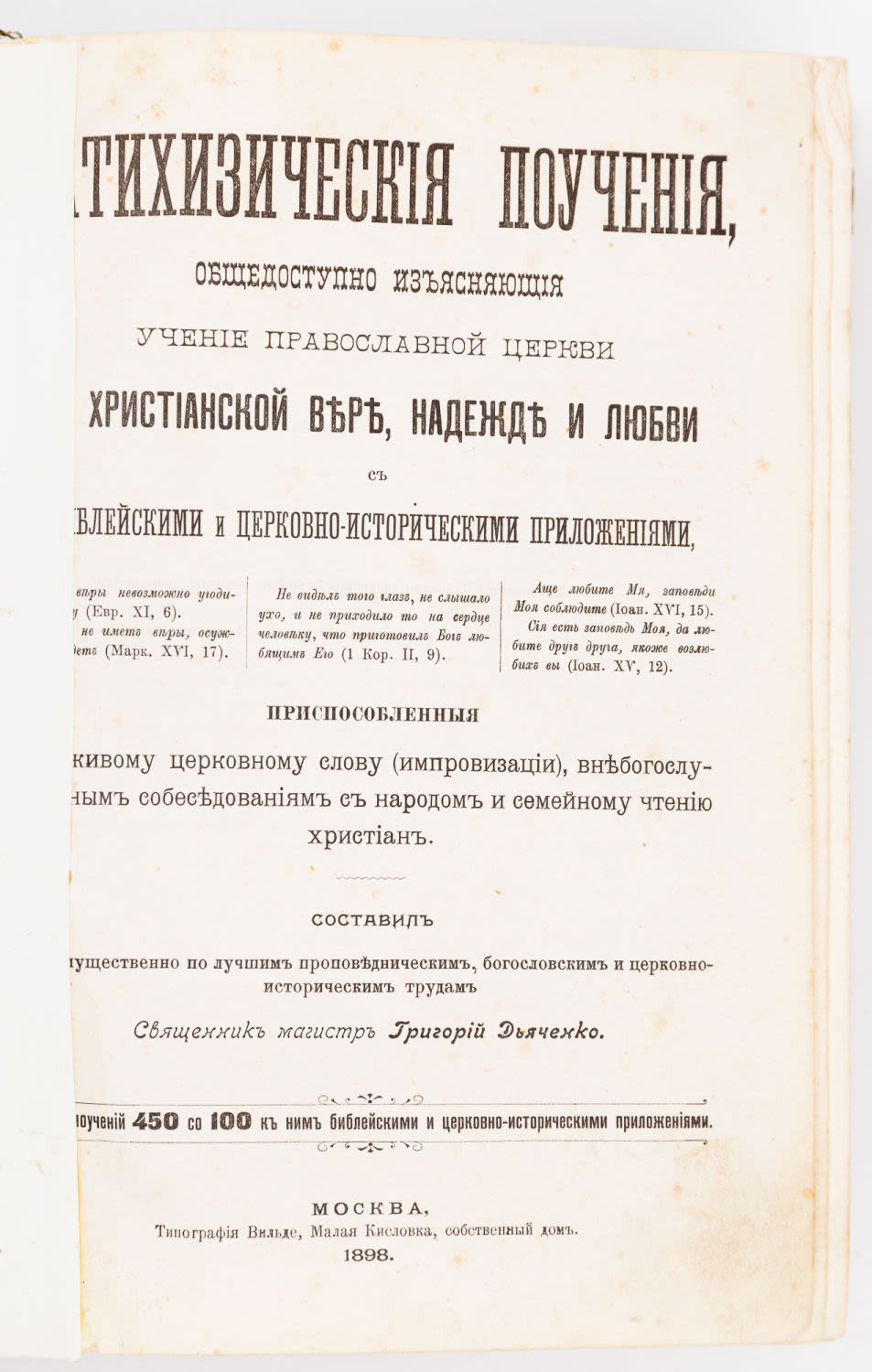 Общедоступно изъясняющие учение православной церкви о христианской вере, надежде и любви: С библейскими и церковно-историческими приложениями; сост. преимущественно по лучшим проповедническим, богословским и церковно-историческим трудам священник магистр Григорий Дьяченко. М.: Т-во И.Д. Сытина, 1898. – XLIV, 1038 с.; 26×17,5 см.