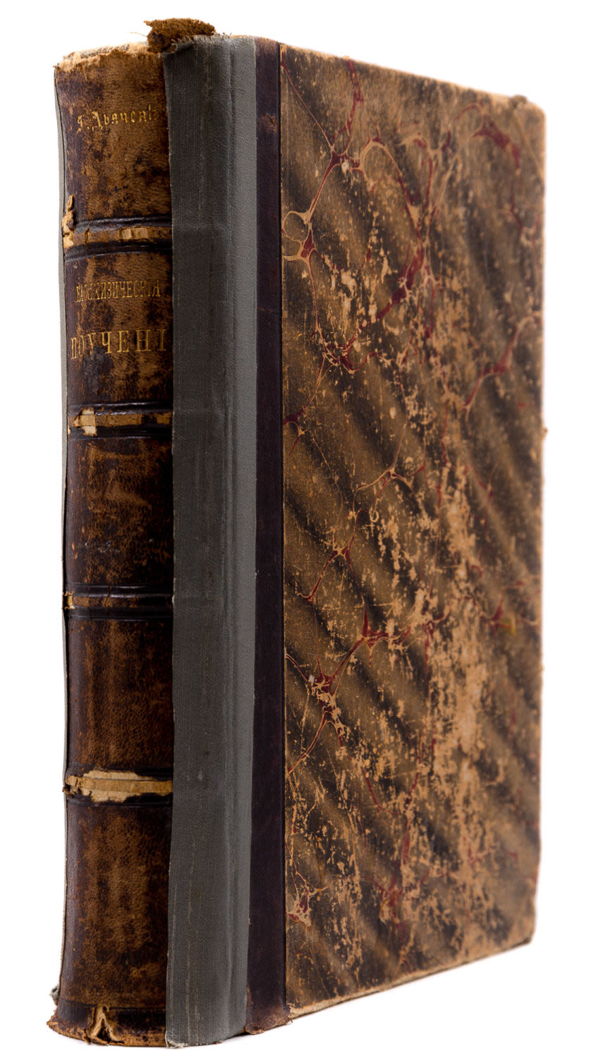 Переплет – владельческий, составной; картон, мраморная бумага, корешок – кожа с золотым тиснением, разделен бинтами на пять сегментов.