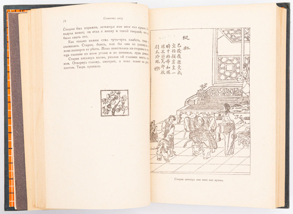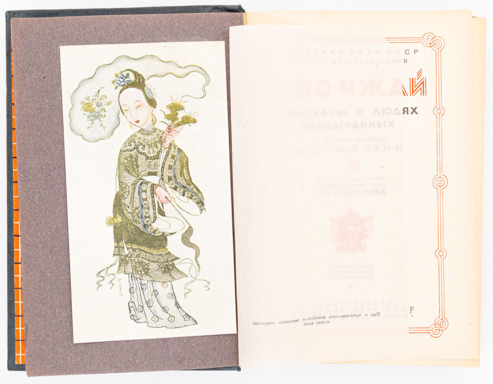 Сборник рассказов китайского новеллиста Пу Сун-Лина (1640-1715) из серии «Описание чудесного из кабинета Ляо». Со множеством рисунков в тексте и цветными иллюстрациями на отдельных листах.