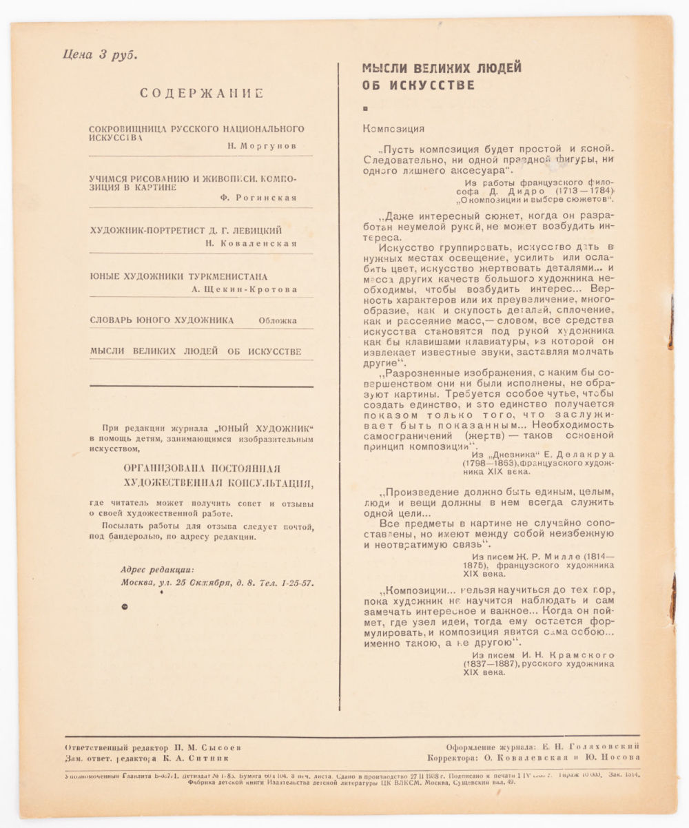 Журнал в популярной, доступной учащимся форме излагал актуальные проблемы искусства, знакомил с историей мирового и русского искусства, творчеством великих мастеров, публиковал советы начинающим художникам.