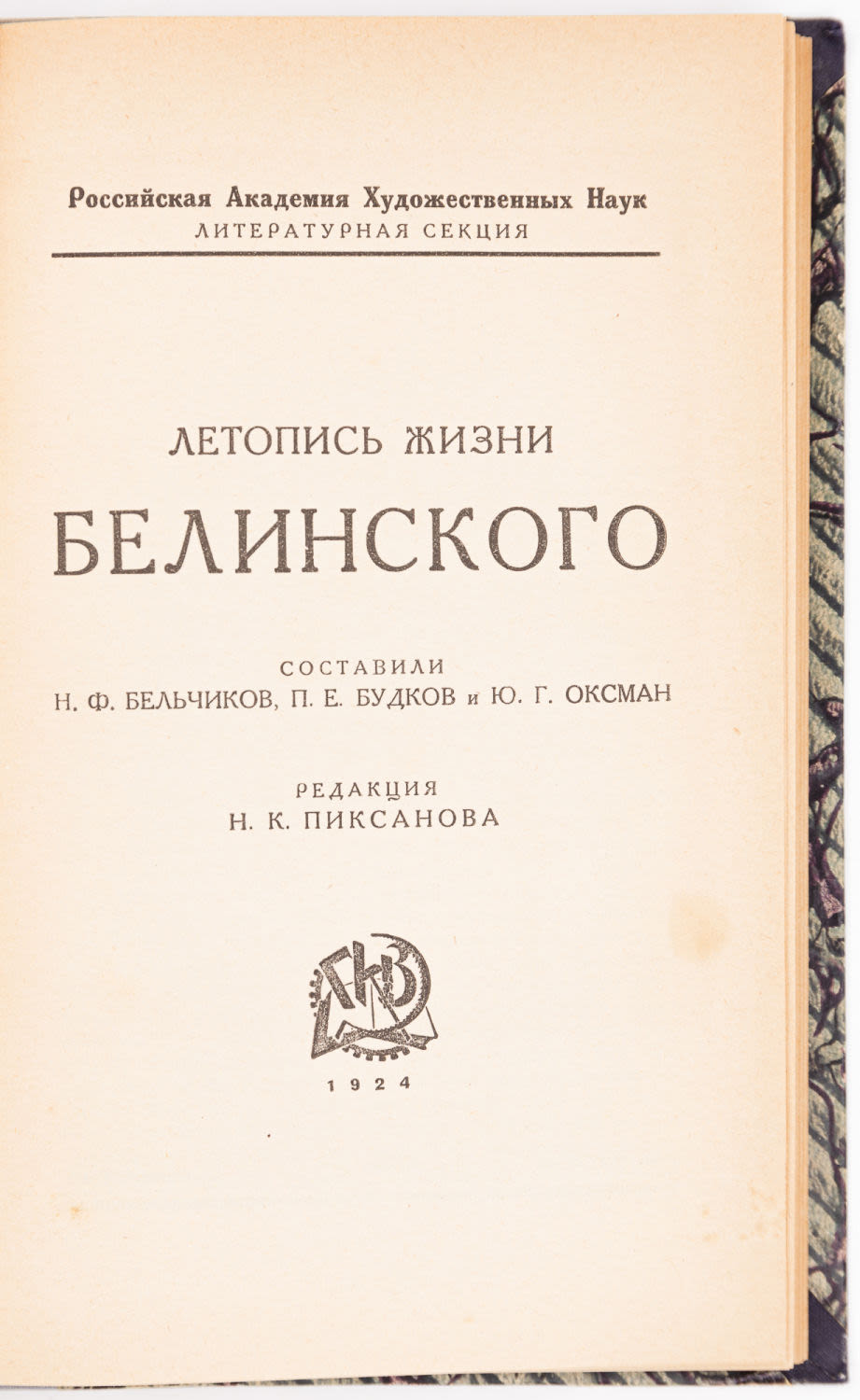 Сост. Н.Ф. Бельчиков, П.Е. Будков и Ю.Г. Оксман; ред. [и предисл.] Н.К. Пиксанова / Российская академия художественных наук; Литературная секция. М.: ГИЗ, 1924. — XIII, [3], 283 с.; 22,6х15,5 см.