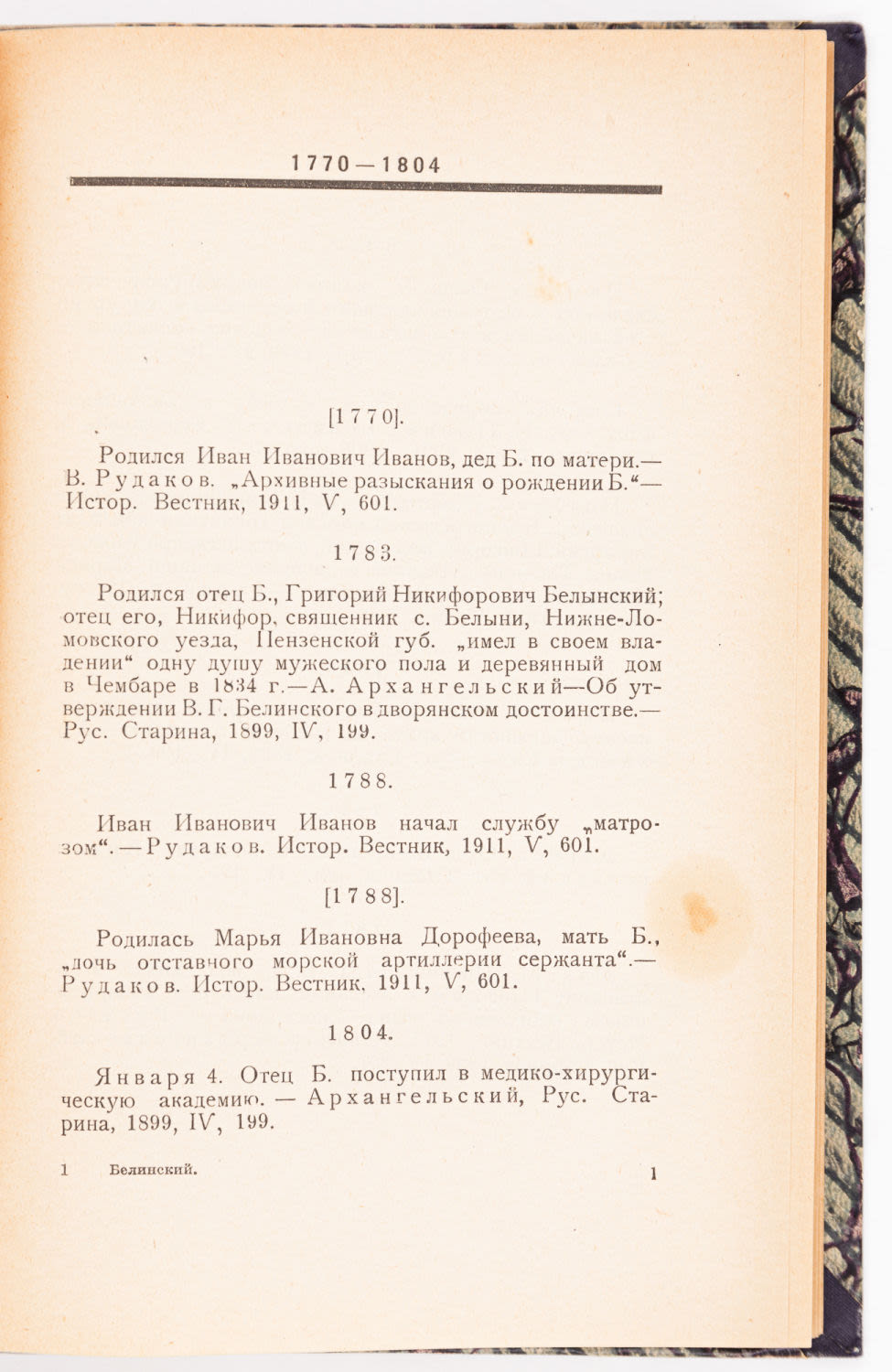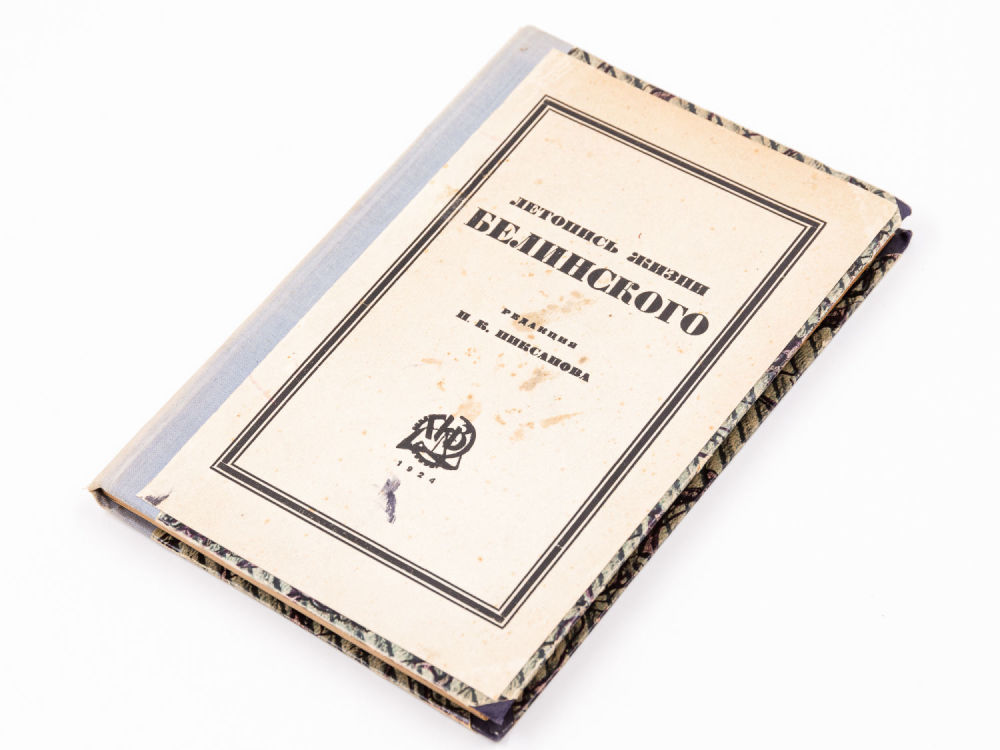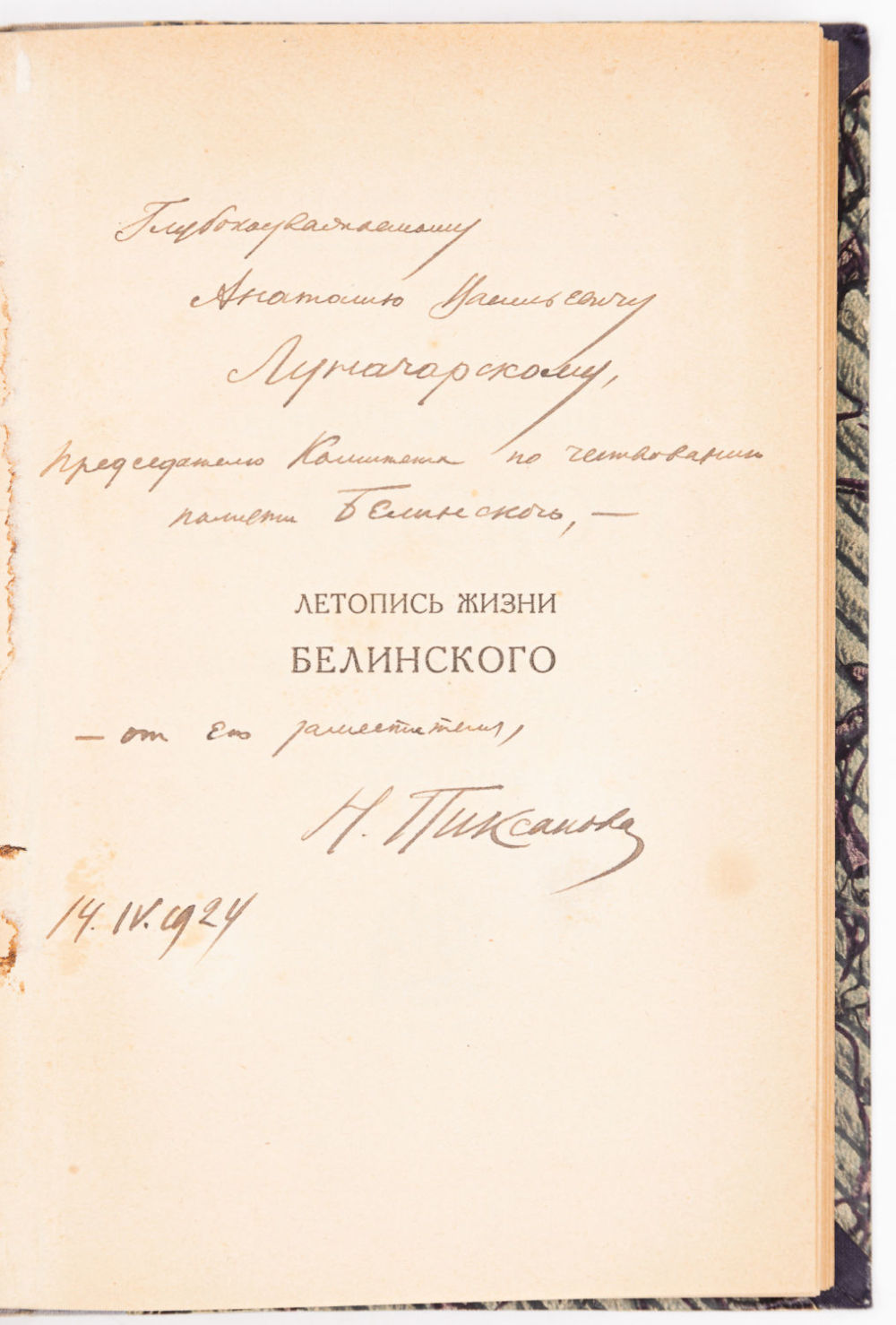 Дарственная надпись Н.К. Пиксанова на первом свободном листе: «Глубокоуважаемому Анатолию Васильевичу Луначарскому, Председателю Комиссии по чествованию памяти Белинского, — от его заместителя, Н. Пиксанова 14. VI. 1924».