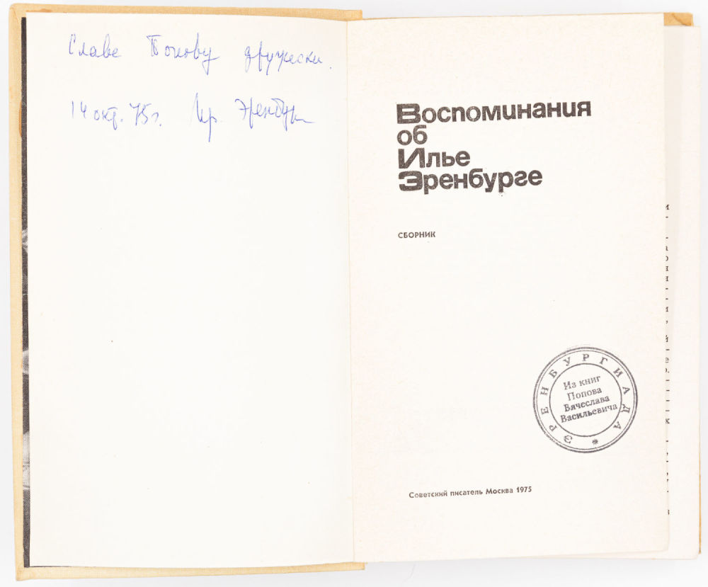 Дарственная надпись на обороте свободного листа форзаца: «Славе Попову дружески. 14 окт. 75 г. Ир. Эренбург».