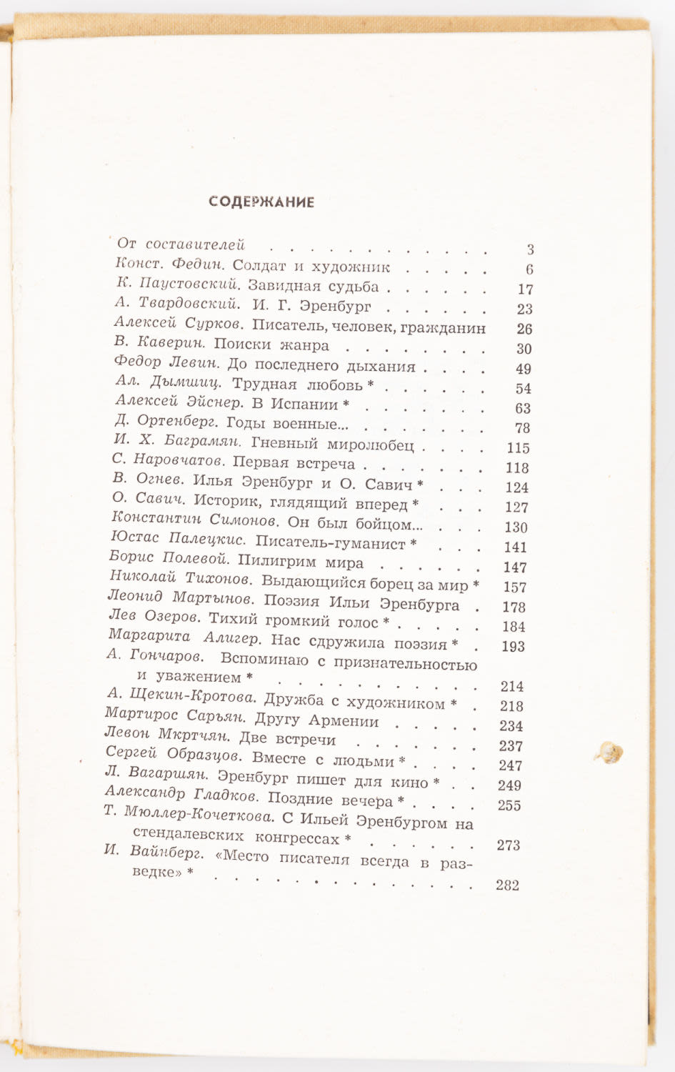 Воспоминания К. Федина, Н. Тихонова, А. Твардовского, К. Симонова, А. Суркова, К. Паустовского, Б. Полевого, М. Алигер, С. Образцова и многих других воссоздают образ Ильи Эренбурга (1891-1967) — писателя, публициста, поэта. Сборник воспроизводит многие страницы биографии писателя в различных обстоятельствах – в годы республиканской Испании, на фронтах Великой Отечественной войны, в редакции газеты "Красная звезда", в зарубежных поездках.