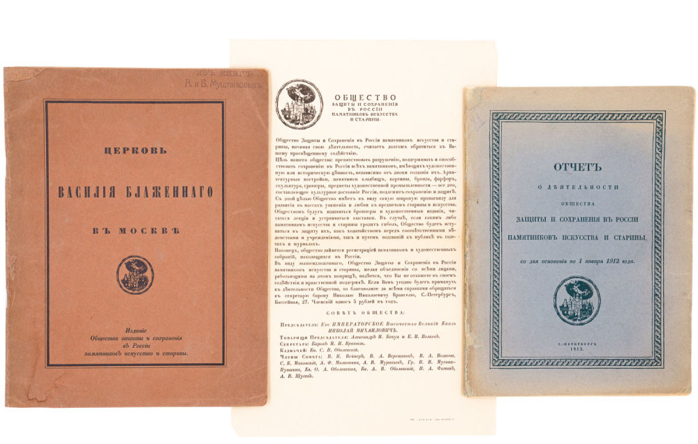 3) Обращение Общества защиты и сохранения в России памятников искусства и старины. СПб.: Сириус, [б.г.]. – [1] л.; 28х18 см.