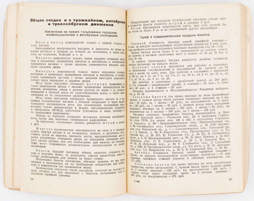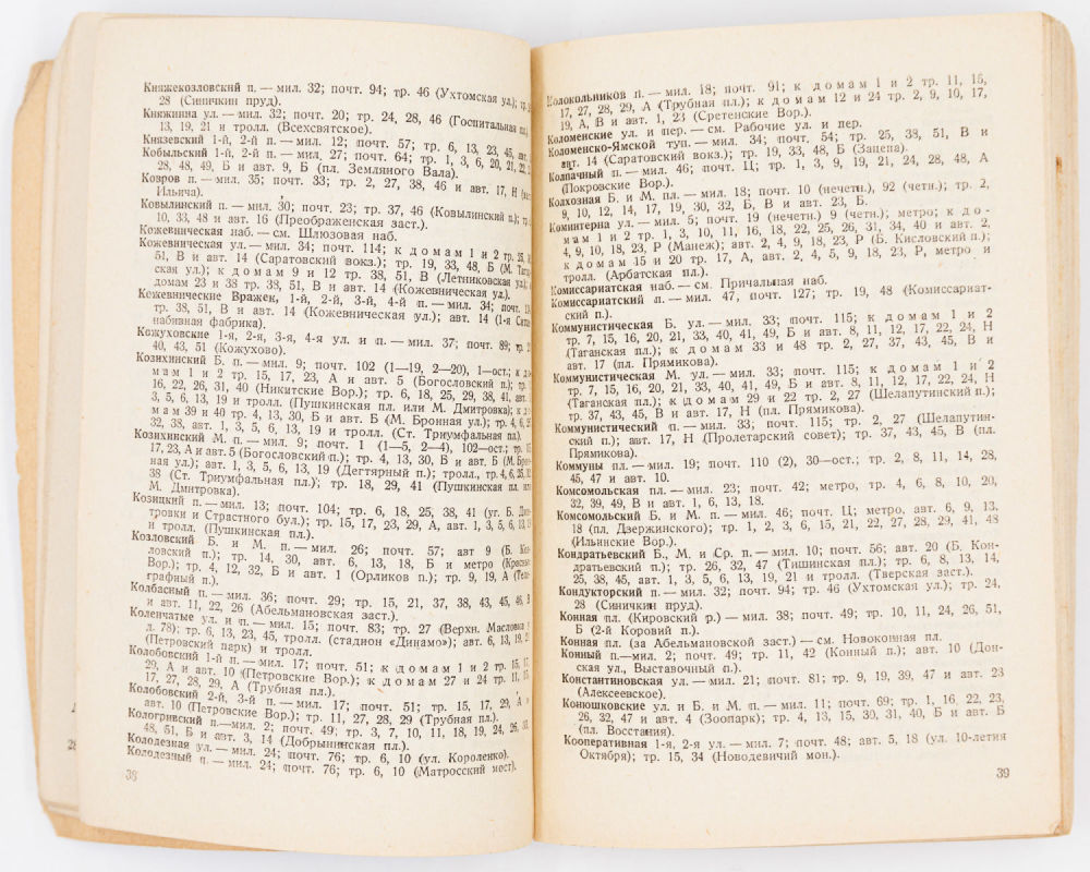 Карманный путеводитель по Москве середины 30-ых годов XX века, в котором описаны основные маршруты движения общественного транспорта, его расписание, приведен перечень всех улиц, площадей, переулков, проездов и тупиков Москвы, с обозначением, какие магистрали путей сообщения проходят по данной улице или вблизи ее.