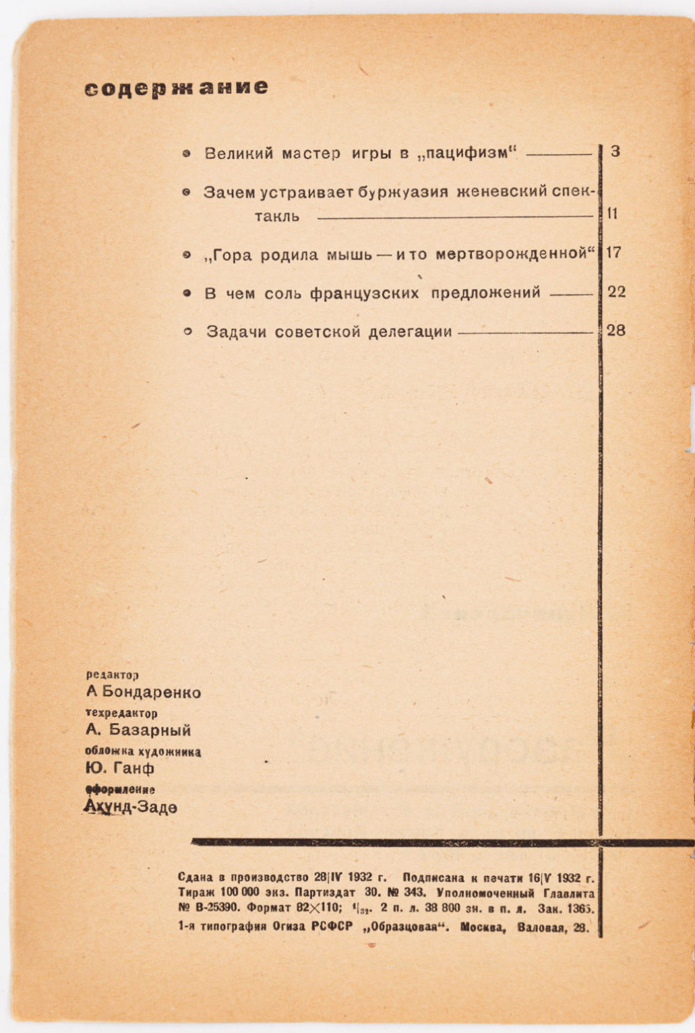 Книга является стенограммой доклада о Женевской конференции, прочитанного А.В. Луначарским в Москве на собрании партийного актива Красной Пресни 31 марта 1932 г.