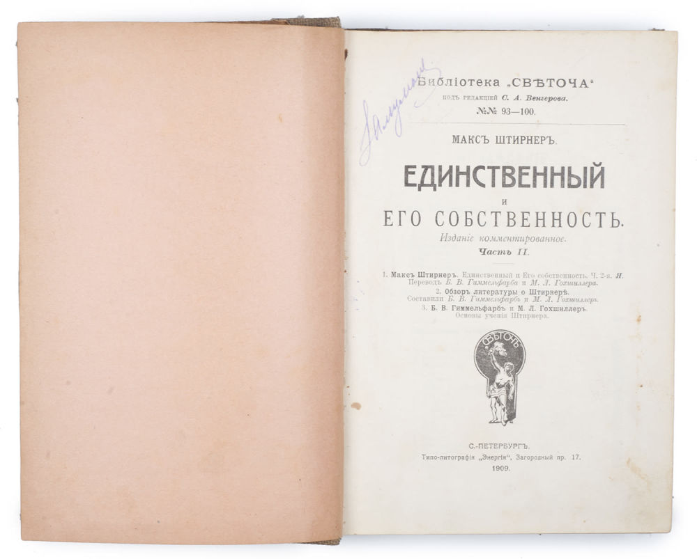 Ч. II: Я; Обзор литературы о Штирнере Основы учения Штирнера; сост. Б.В. Гиммельфарб и М.Л. Гохшиллер, Б.В. Гиммельфарб и М.А. Гохшиллер. 1909. – [2], III, [5], 542 с.; 21×14 см.