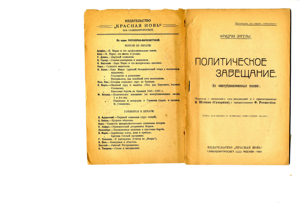 Пер. с нем. под ред. и с прим. И. Шубина (Самарина), с предисл. Ф. Ротштейна. — 2-е изд. М.: Красная новь, 1923. — [2], VI, 40 с.; 22х15 см.