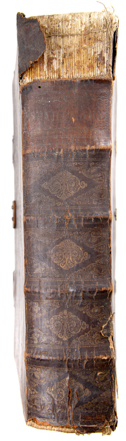 Переплет – доски, кожа, корешок – разделен бинтами на шесть сегментов с золотым тиснением на верхней крышке.