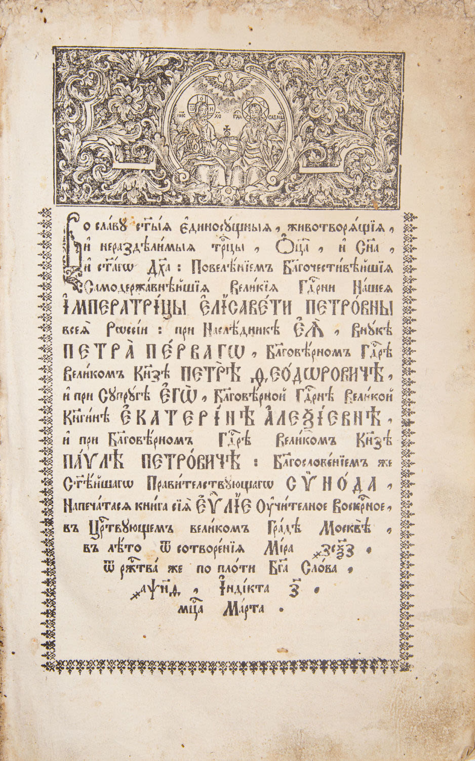 М.: Синодальная тип., март 1759. – [1], 4, 400 л.; 34×22 см.