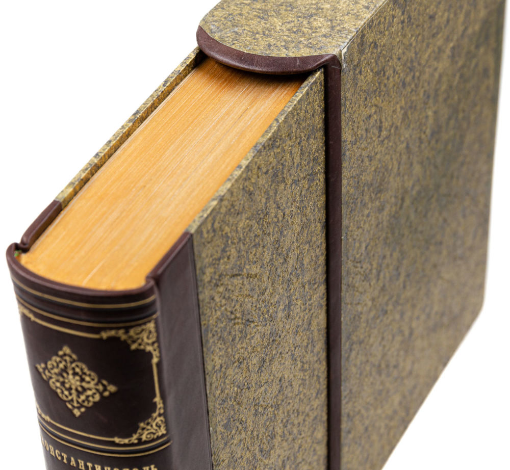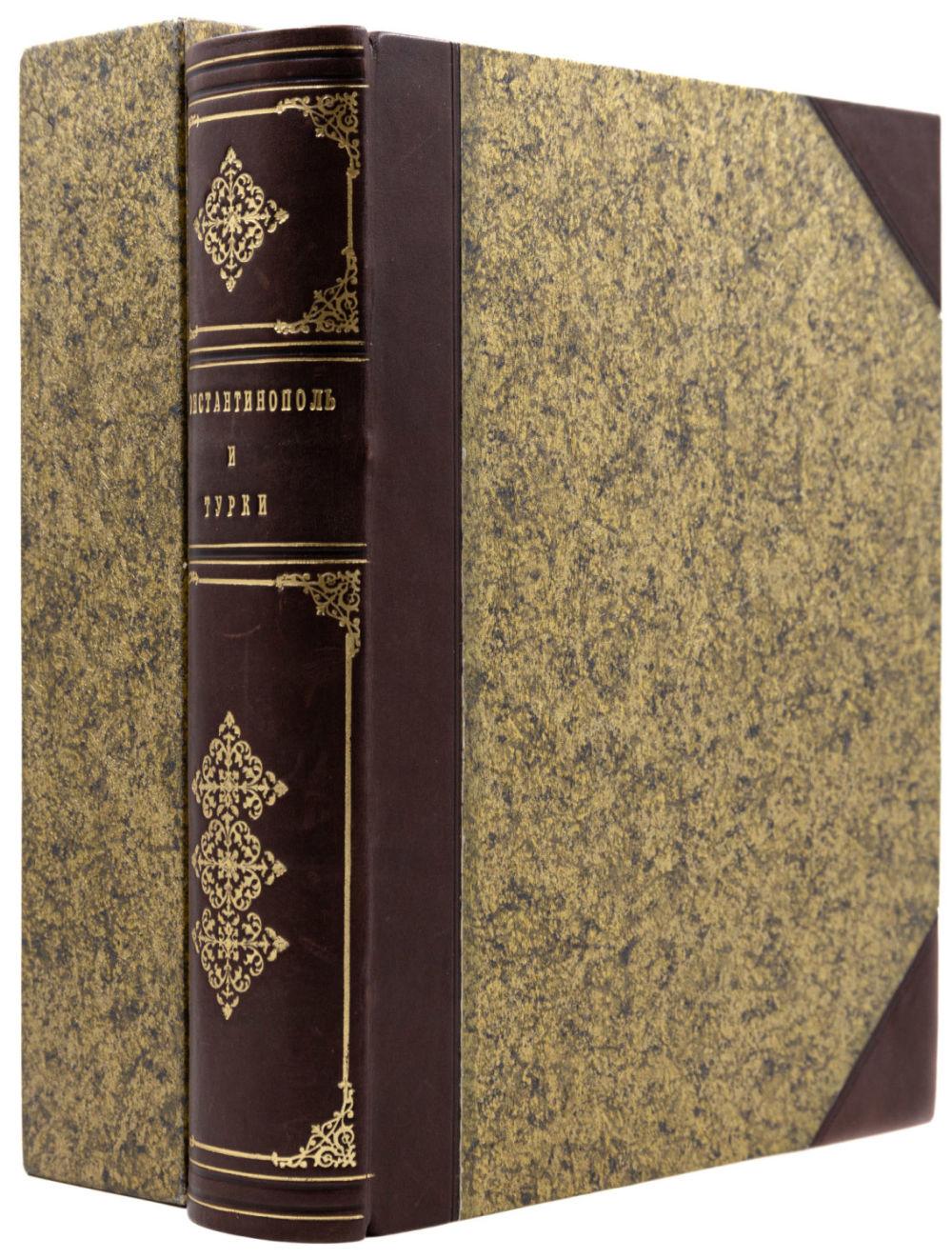 Переплет – владельческий, художественный; картон, орнаментированная бумага, корешок – кожа с золотым тиснением, трехсторонний золоченый обрез.