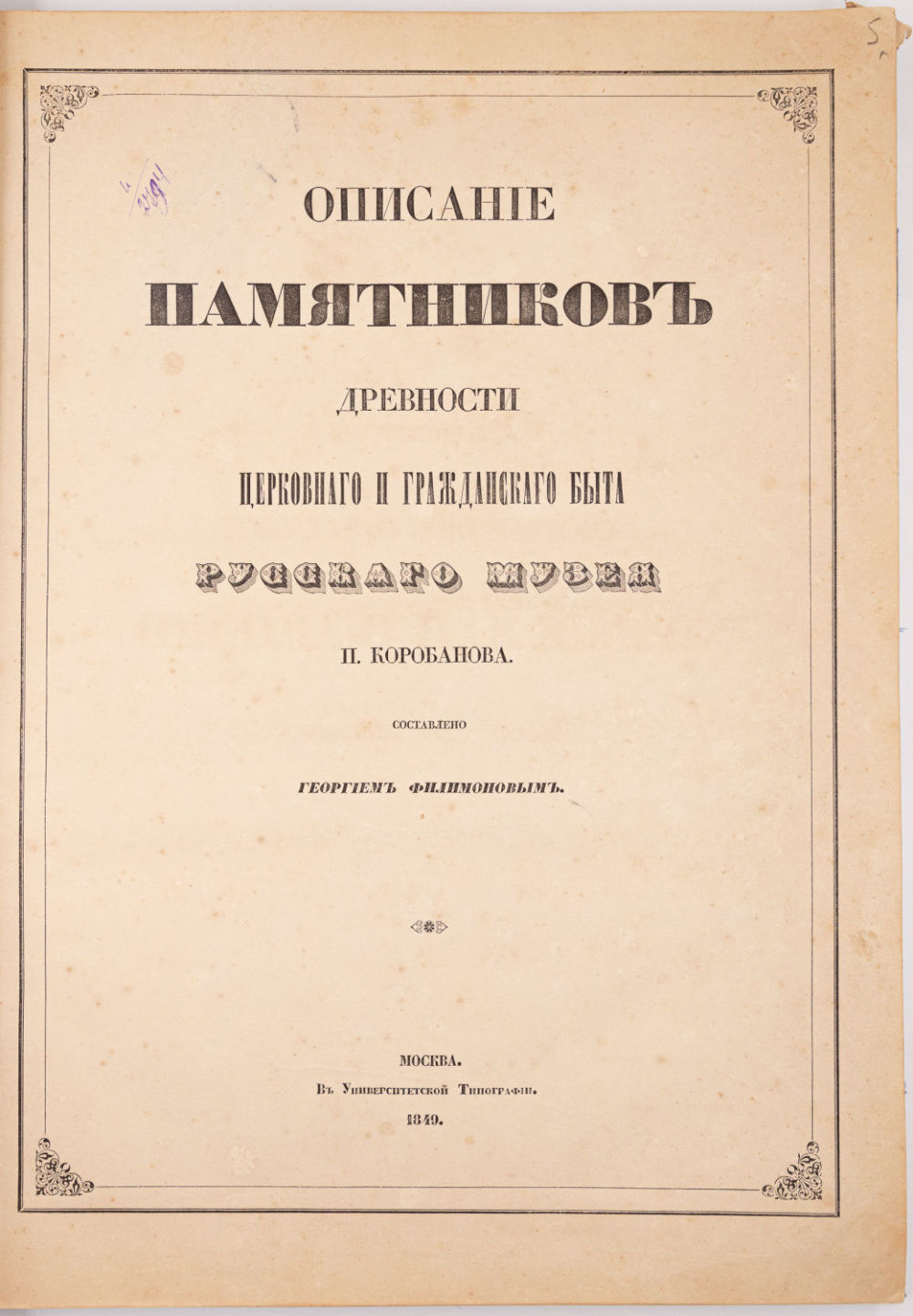 Павел Федорович Карабанов (Коробанов; 1767-1851) — крупный коллекционер русских древностей. Значительную часть коллекции Карабанова составили произведения декоративно-прикладного искусства XV-XVIII вв. и предметы быта, в т.ч. личные вещи русских царей. В собрание Карабанова входили около 2 000 русских и иностранных монет и медалей, кабинет эстампов (свыше 3 000 листов). С 1830-х гг. его коллекция была широко известна как «Русский музей П.Ф. Карабанова», размещавшийся в двух залах его дома на Петровке. В библиотеке Карабанова хранились рукописи и документы XVII в., собрание автографов и другие материалы. По завещанию хозяина коллекция поступила в собственность Николая I и распределена между Оружейной палатой, Эрмитажем, Императорской публичной библиотекой, Архивом Министерства юстиции и Московским университетом. Данный каталог составлен ещё при жизни автора.