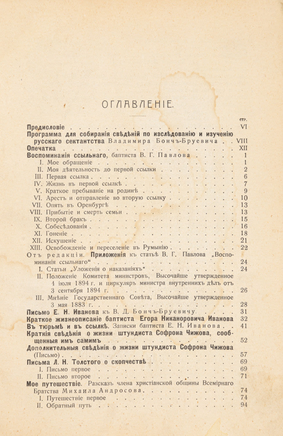 Вып. 1: Баптисты. Бегуны. Духоборцы. Л. Толстой о скопчестве. Павловцы. Поморцы. Старообрядцы. Скопцы. Штундисты. 1908. – XII, 314 с.; 23,5×17 см.