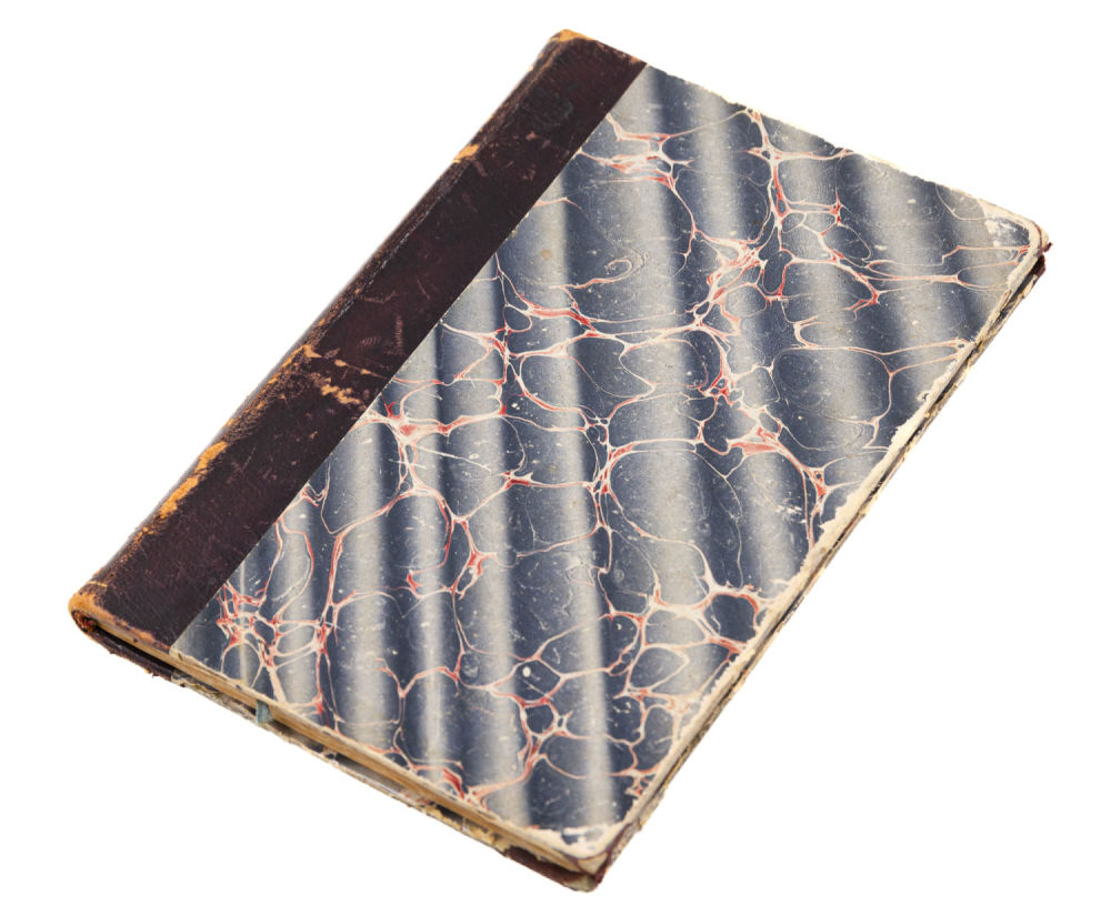 Переплёт – владельческий составной; крышки – картон, «мраморная» бумага, корешок – кожа с золотым тиснением, ляссе.
