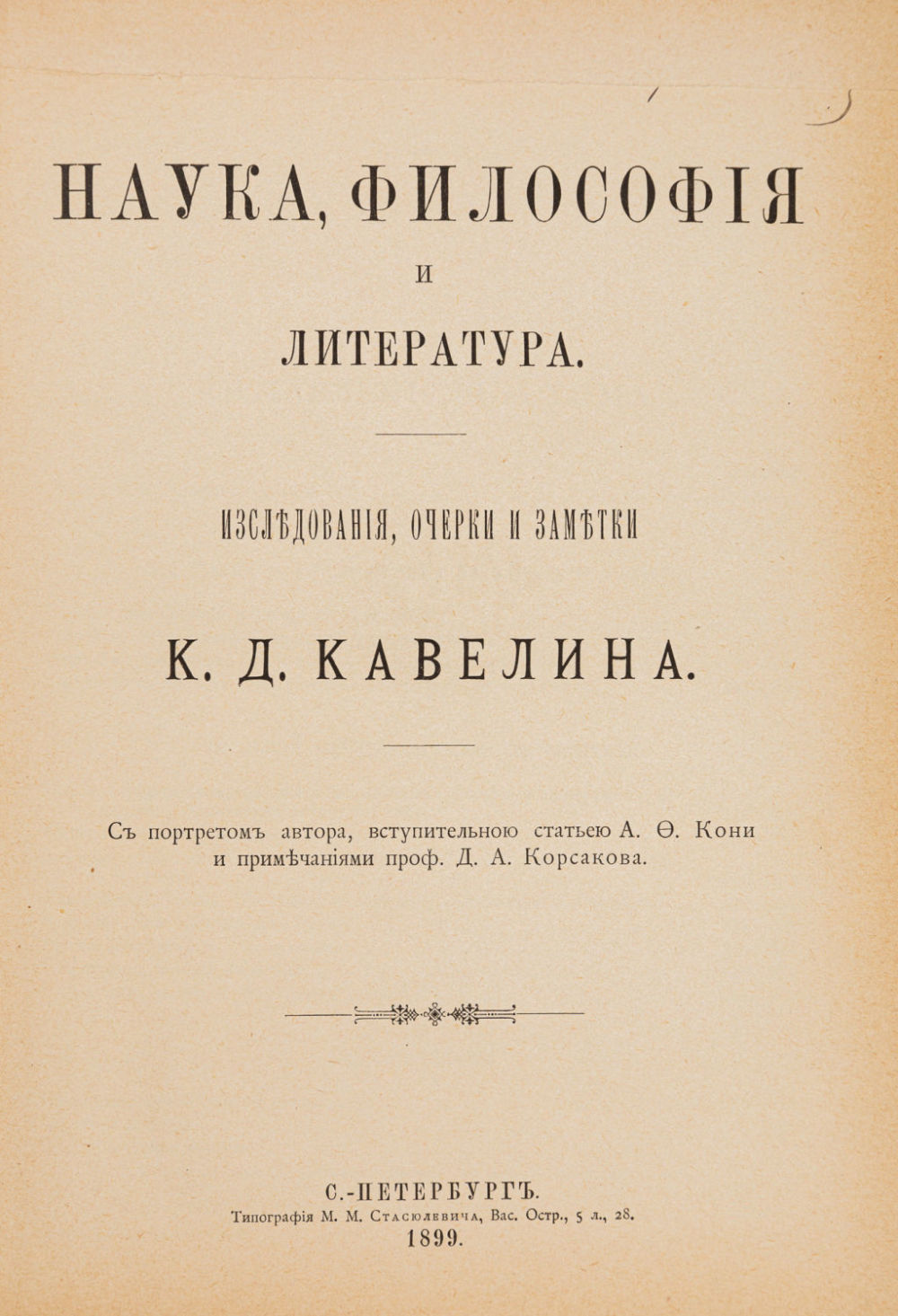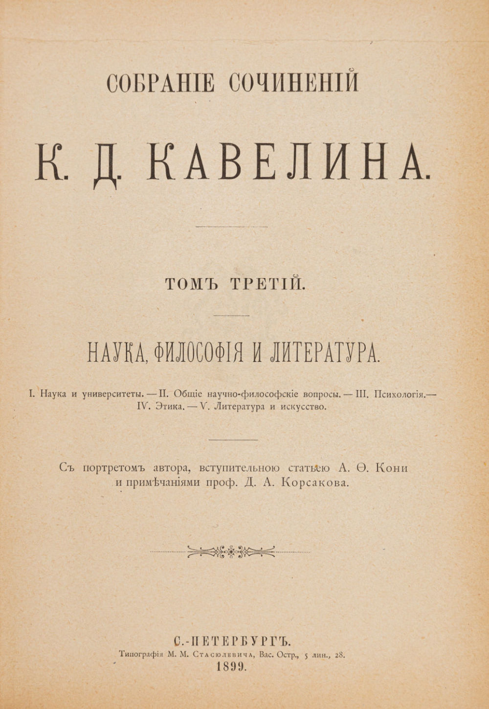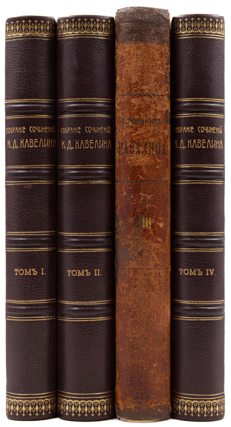 Т. 3: Наука, философия и литература: Исслед., очерки и заметки К.Д. Кавелина; с портр. авт., вступ. ст. А.Ф. Кони и примеч. проф. Д.А. Корсакова. 1899. – XX с., 1256 стб., [1] л. фронт. (портр.); 27,5×18 см.