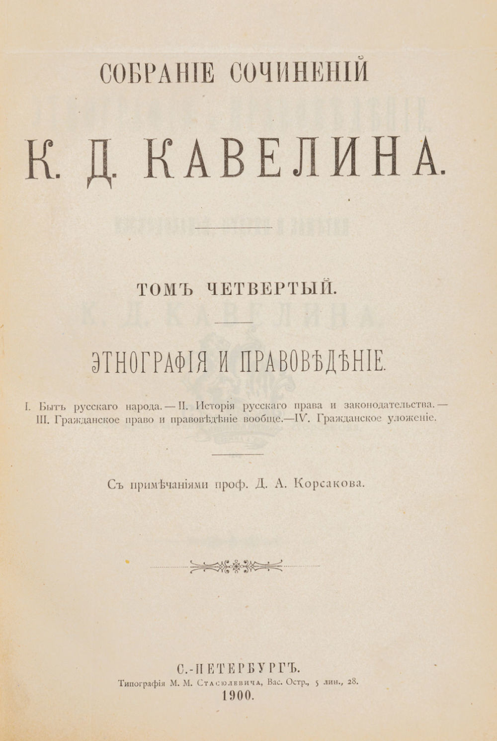Т. 4: Этнография и правоведение: Исслед., очерки и заметки К.Д. Кавелина; с примеч. проф. Д.А. Корсакова. 1900. – VI с., 1348 стб.; 27×18,5 см.