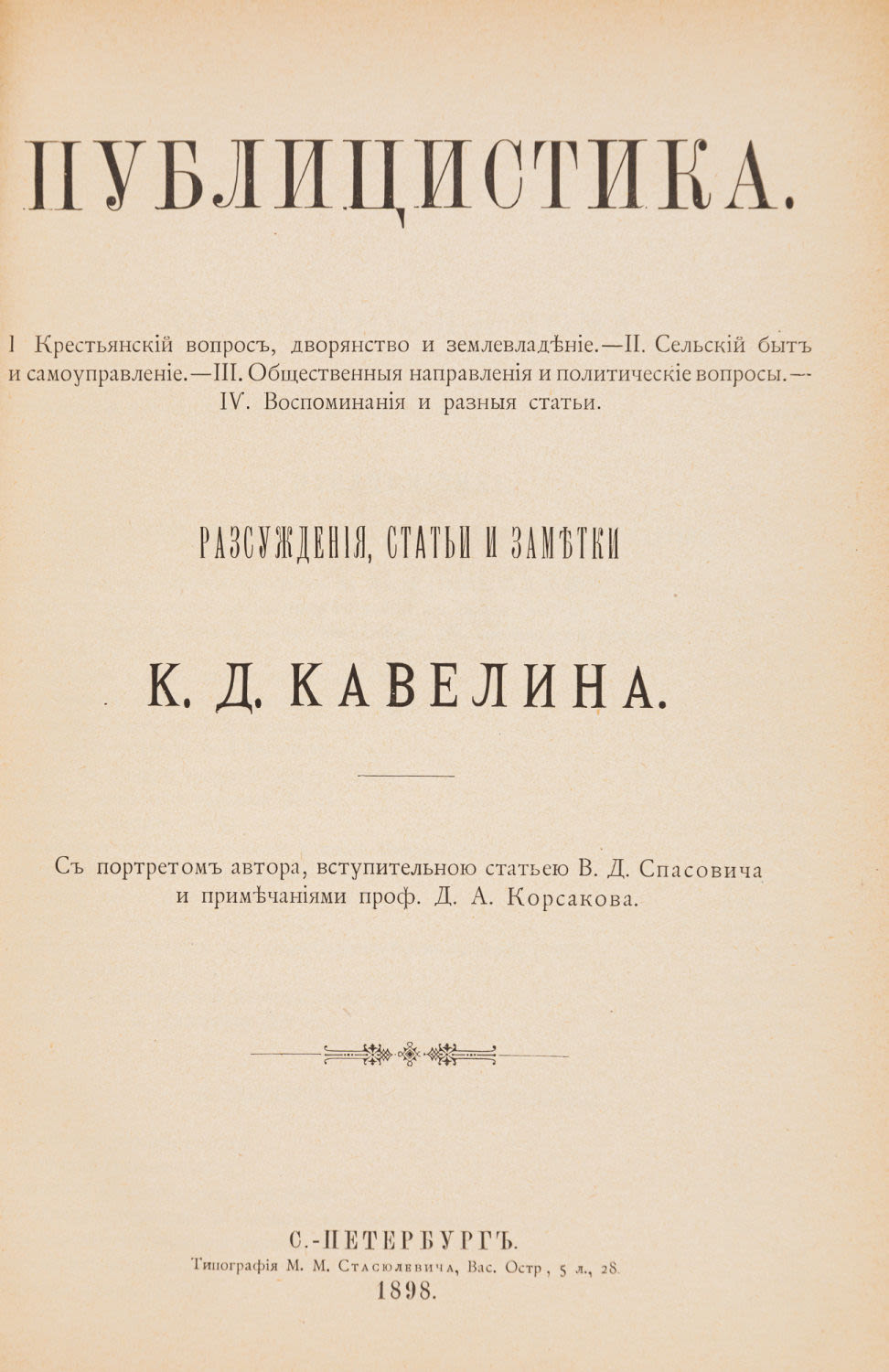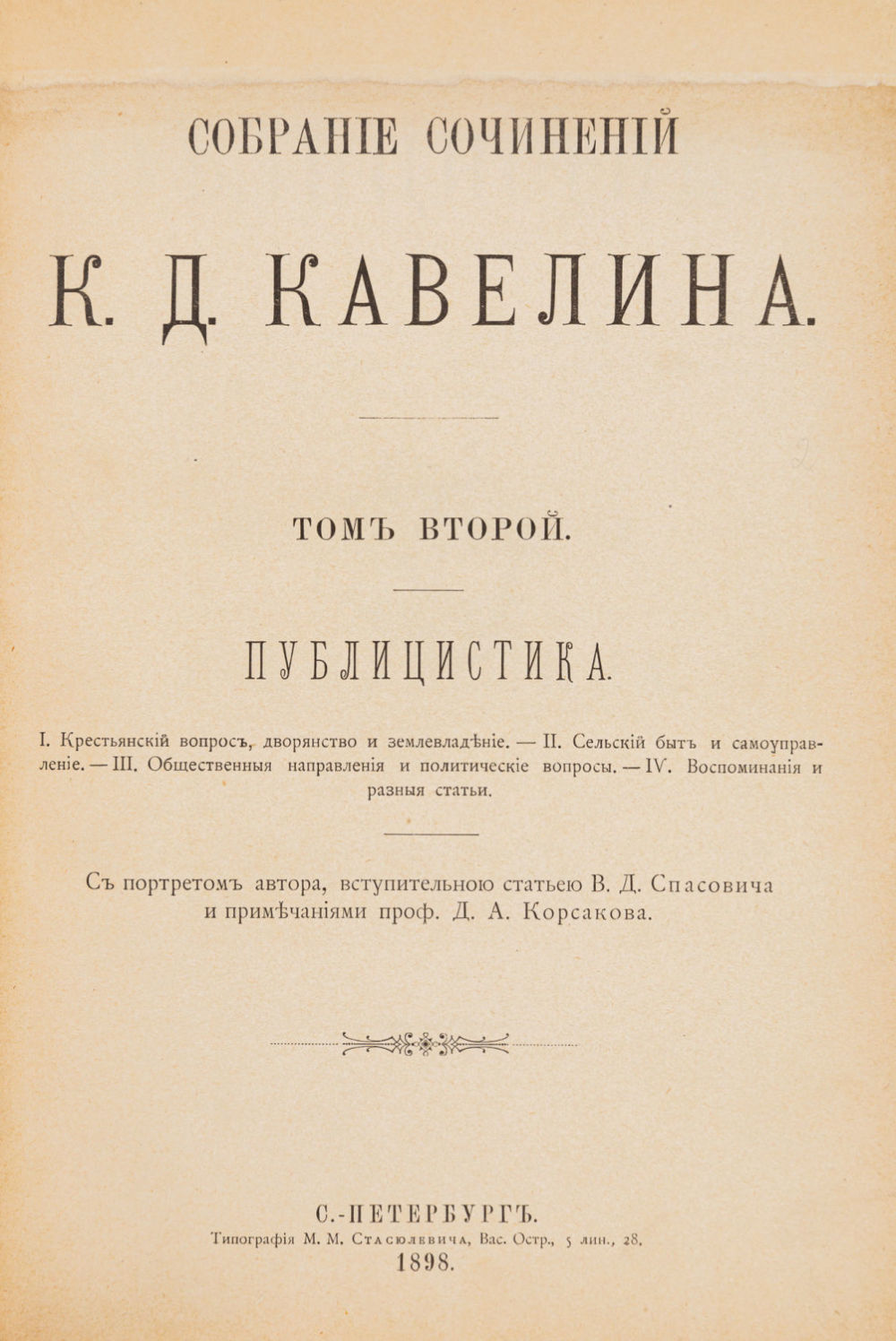 Т. 2: Публицистика: Рассуждения, ст. и заметки К.Д. Кавелина; с портр. авт., вступ. ст. В.Д. Спасовича и примеч. проф. Д.А. Корсакова. 1898. – XXXII с., 1258 стб., [1]. л. фронт. (портр.);