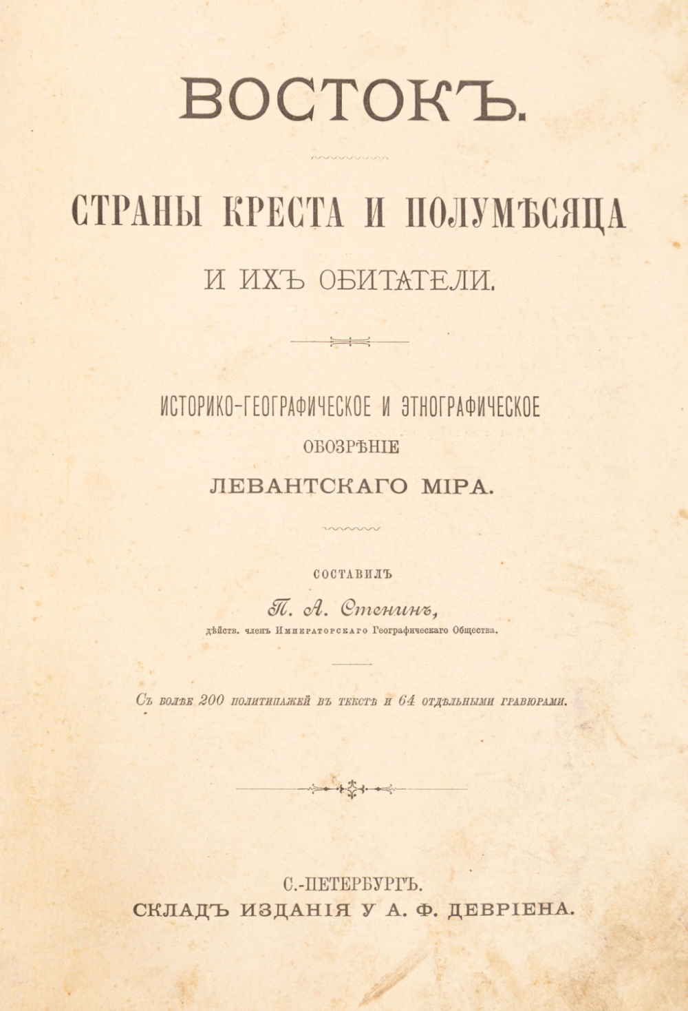 Историко-географическое и этнографическое обозрение Левантского мира. СПб.: Изд. А.Ф.Девриена, [1892]. – [4], VI, [2], 498, [2] с.: ил., [1] л. фронт., [61] л. ил.; 25х19 см.