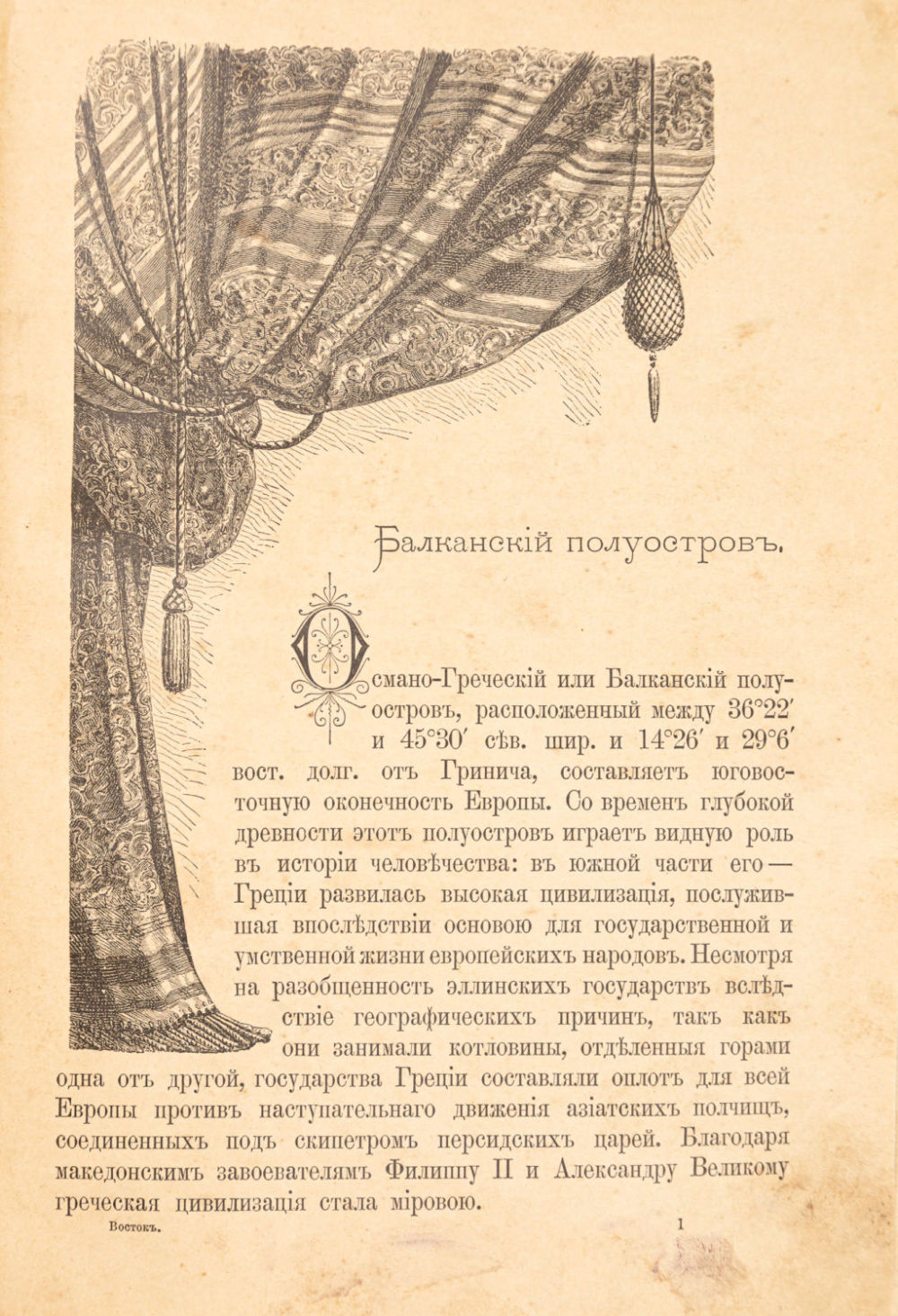 В трех разделах описаны Европейская, Азиатская и Африканская части некогда огромной империи: Босния и Герцеговина, княжество Черногория, королевство Сербия, княжество Болгария, Турецкая (Оттоманская) империя, Греция, Малая Азия и Анатолия, Остров Кипр, Нубия, Триполи и др.