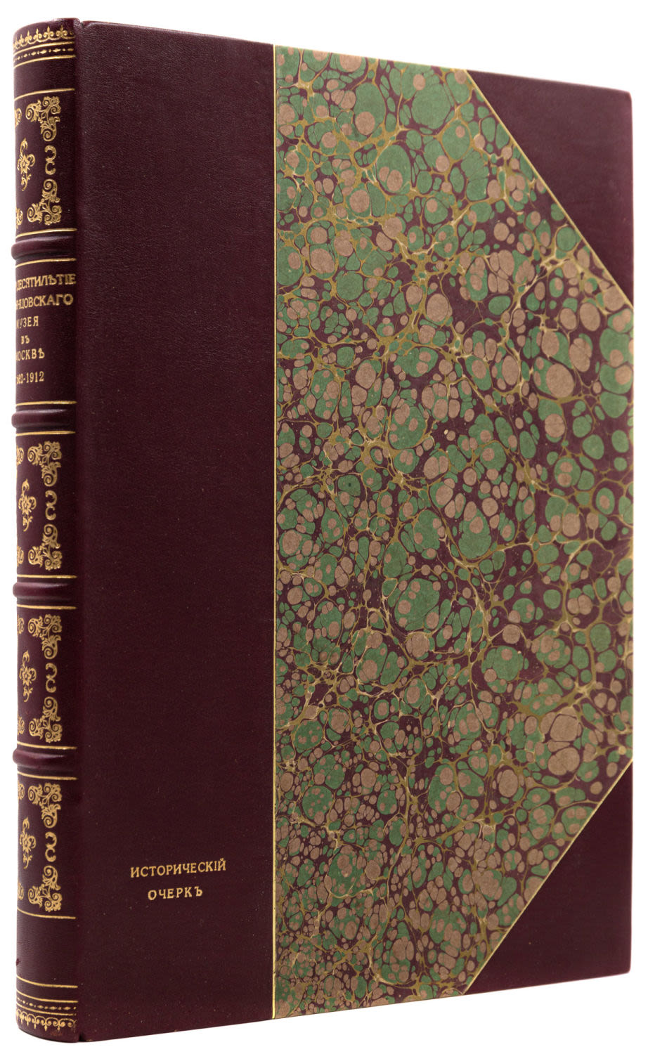 Переплет – владельческий; картон, мраморная бумага, корешок – кожа с золотым тиснением, разделен бинтами на пять сегментов, трехсторонний торшонированный обрез.