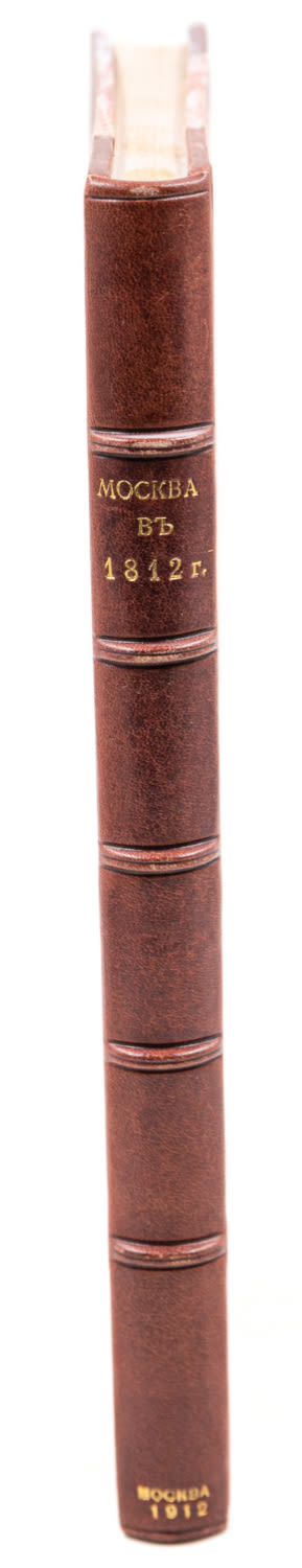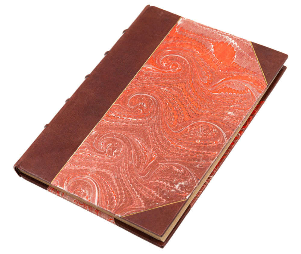 Переплёт – владельческий составной, крышки – картон, бумага «под павлинье перо», корешок и уголки – кожа, золототисненный корешок поделен бинтами на 6 сегментов, крапчатый обрез.