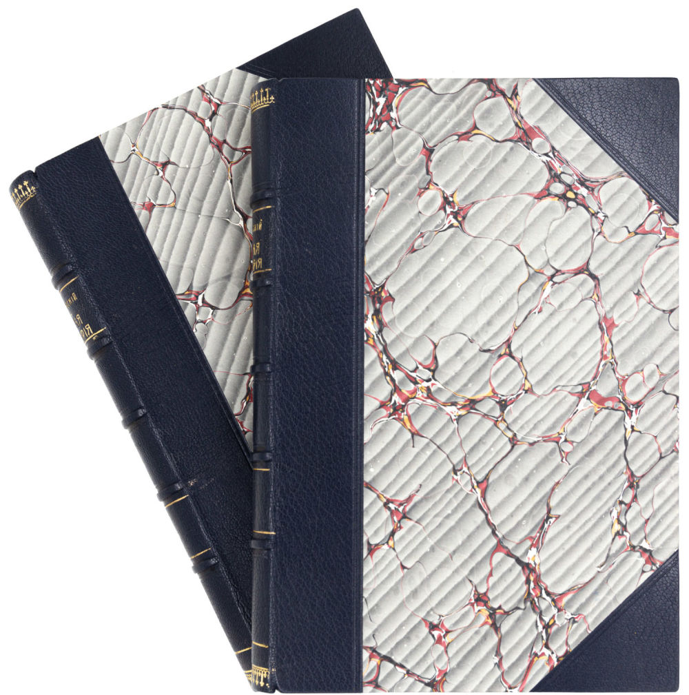 Переплёт – владельческий составной; крышки – картон, «мраморная бумага», корешок и уголки – кожа, золототисненный корешок разделен бинтами на 6 сегментов.