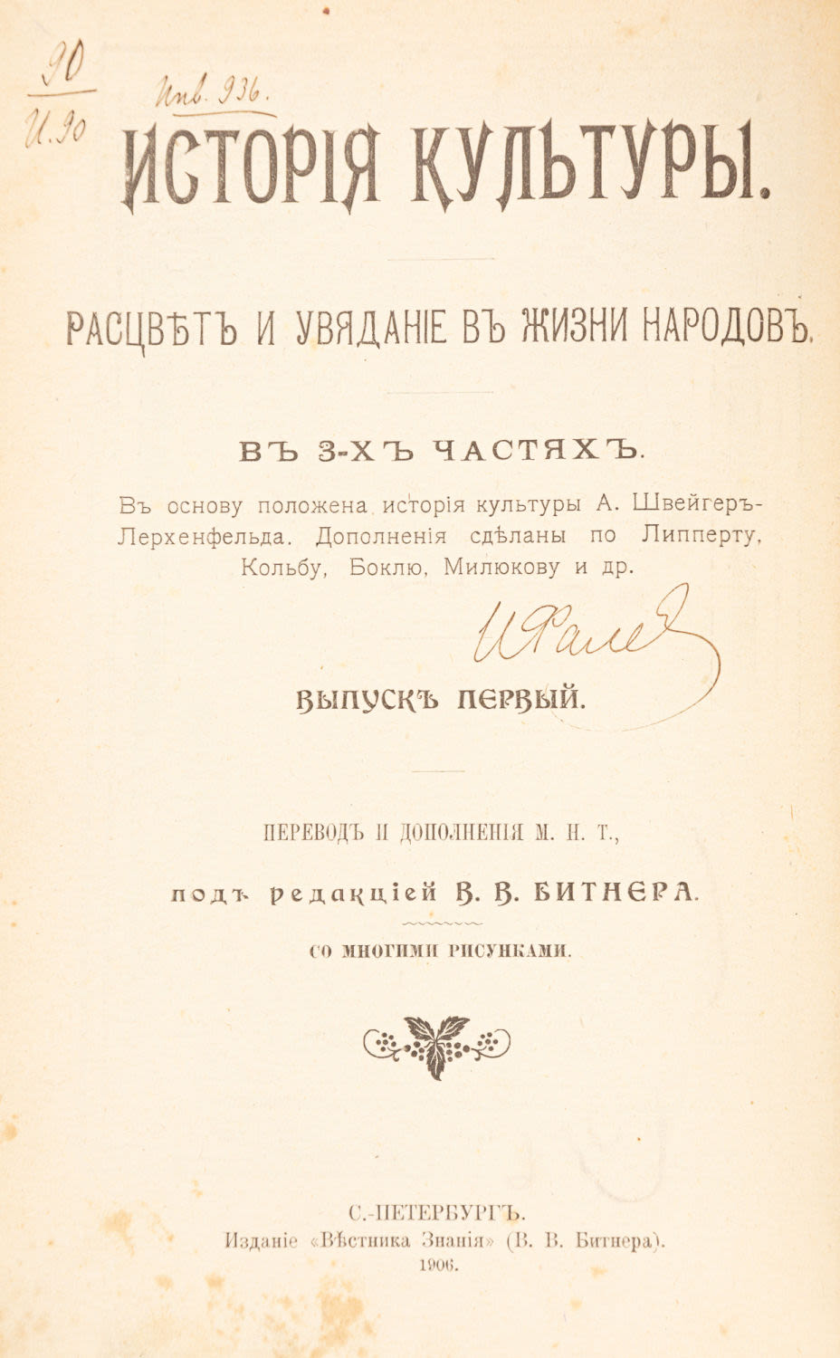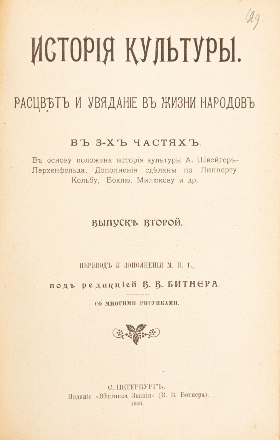 В основу положена история культуры А. Швейгер-Лерхенфельда; дополнения сделаны по Липперту, Кольбу, Боклю, Милюкову и др.; под ред. В.В. Битнера, пер. и доп. М.Н.Т. СПб.: Изд. «Вестника знания», 1906.