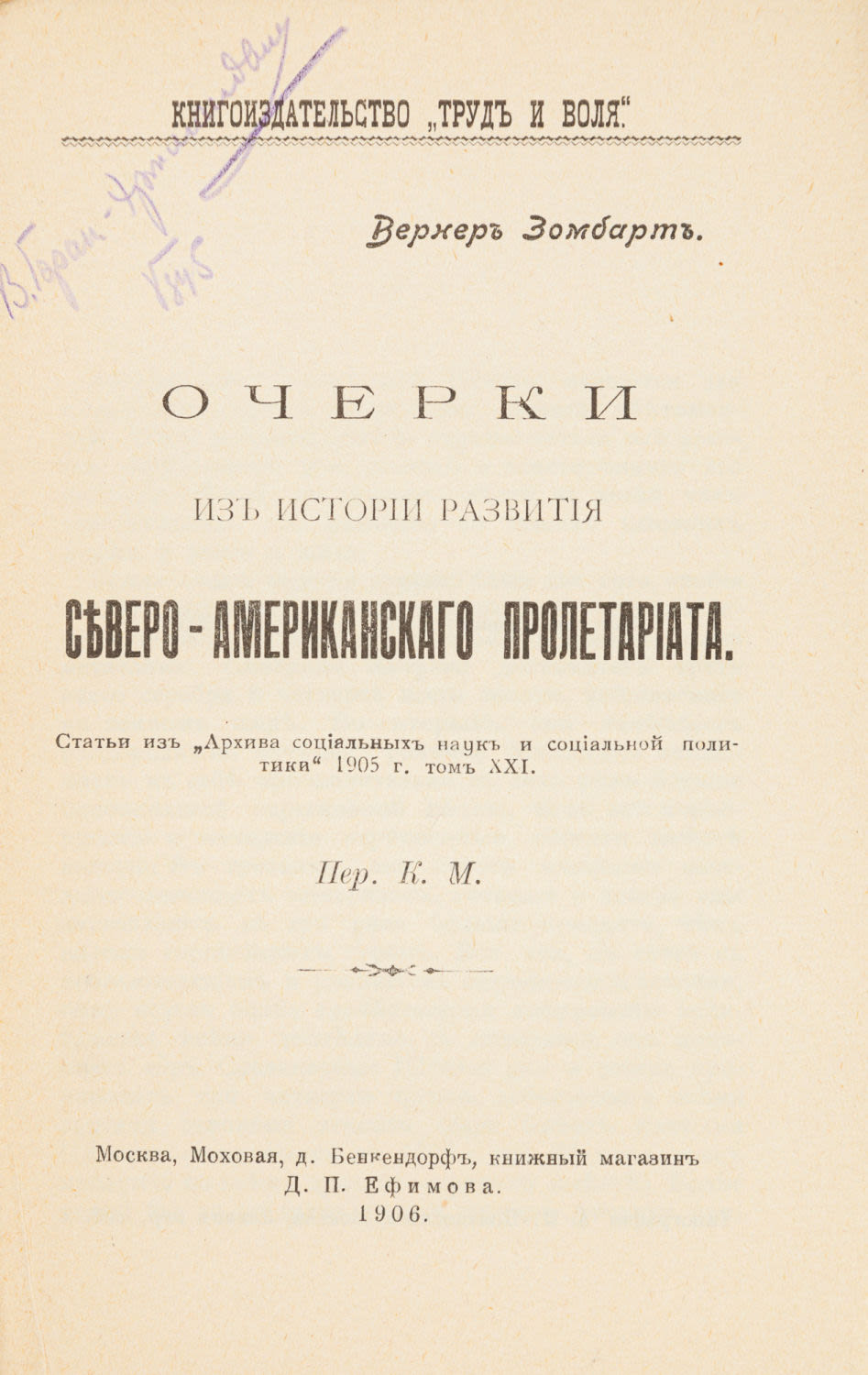 Статьи из «Архива социальных наук и социальной политики» 1905 г., Т. XXI; пер. К. М. М.: Кн-во «Труд и воля», 1906. — 174 с.; 19х13 см.