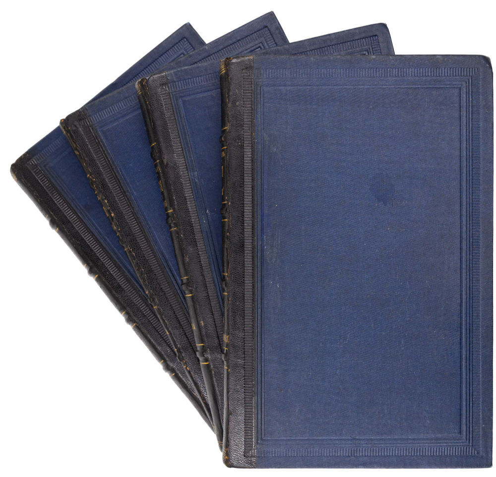 Сохранность – хорошая, потёртости и небольшие загрязнения переплёта, фрагментарная реставрация корешка, трещины бумаги вдоль форзацев (Т. 1, 2, 4), шт. бук. маг. на обороте св. л. форзаца (Т.1, 2, 4), небольшие загрязнения и следы от перелистывания (Т. 1, 2, 4), карандашные читательские пометы (Т. 3), трещины и следы влаги в блоке (Т. 2), небольшие загрязнения обрезов (Т. 2,4).