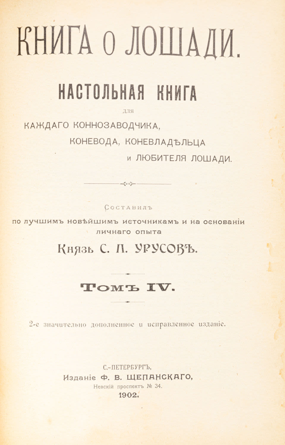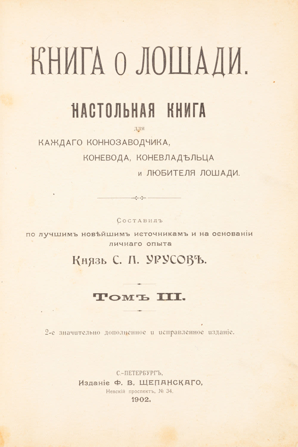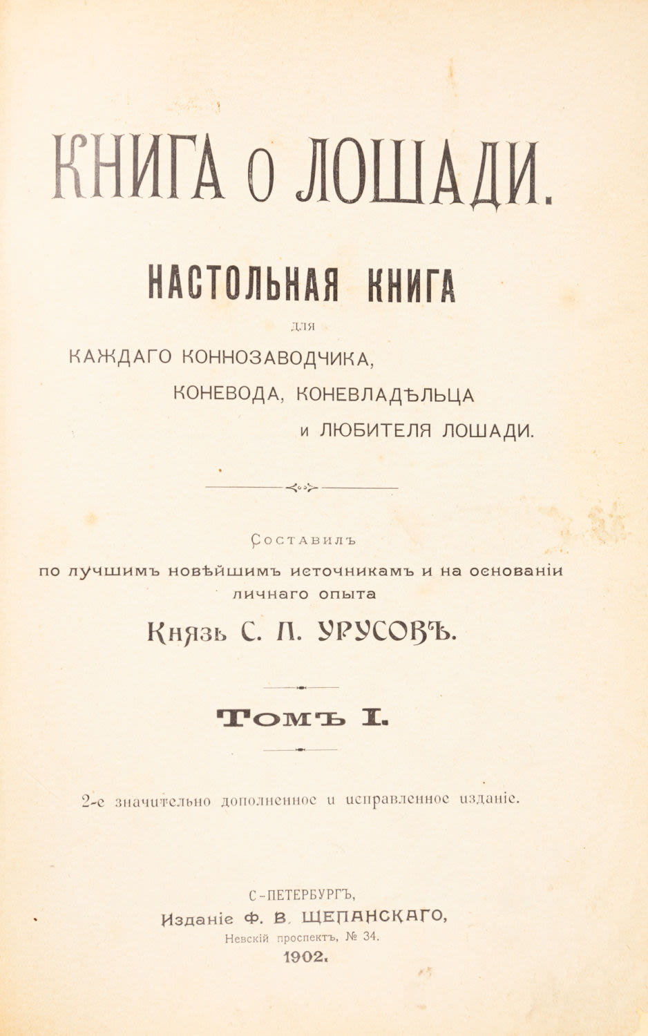 Настольная книга для каждого коннозаводчика, коневода, коневладельца и любителя лошади; составил по лучшим новейшим источникам и на основании личного опыта князь С.П. Урусов. – 2-е знач. доп. и испр. издание. СПб.: Изд. Ф.В. Щепанского, 1902.